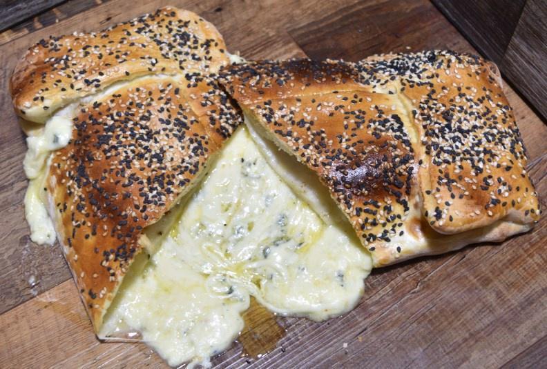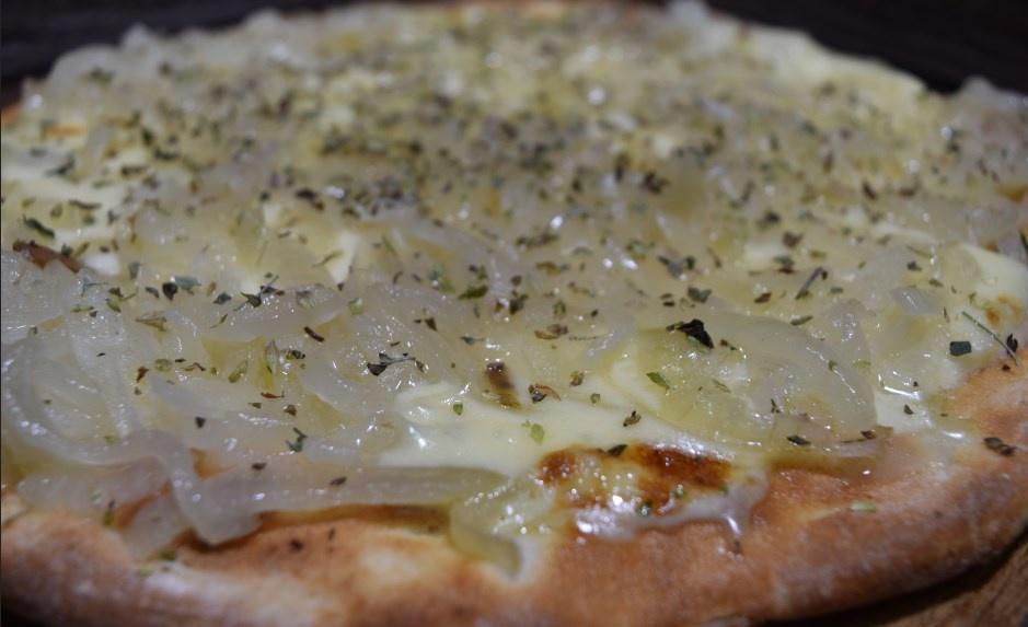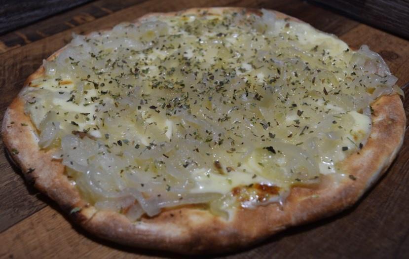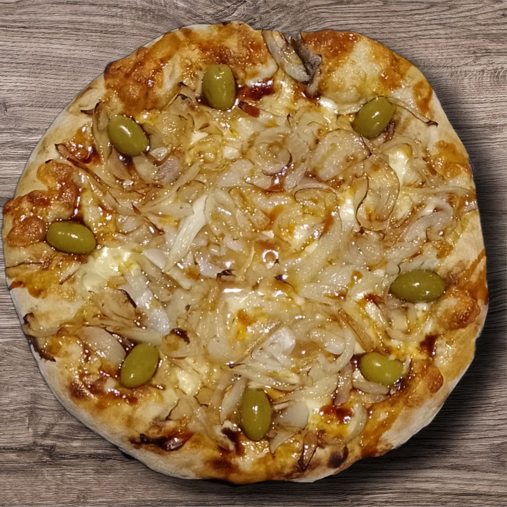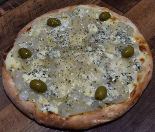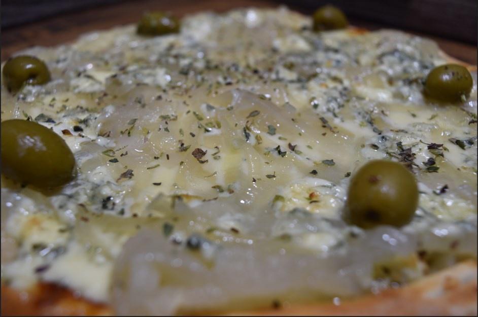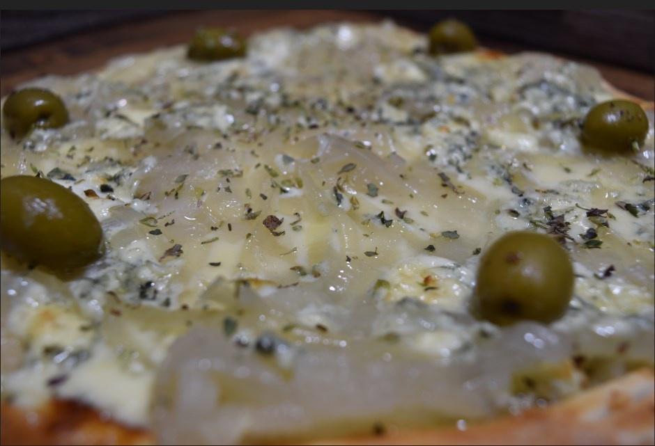 Cebolla rehogada, muzzarella, roquefort, aceitunas verdes y orégano.