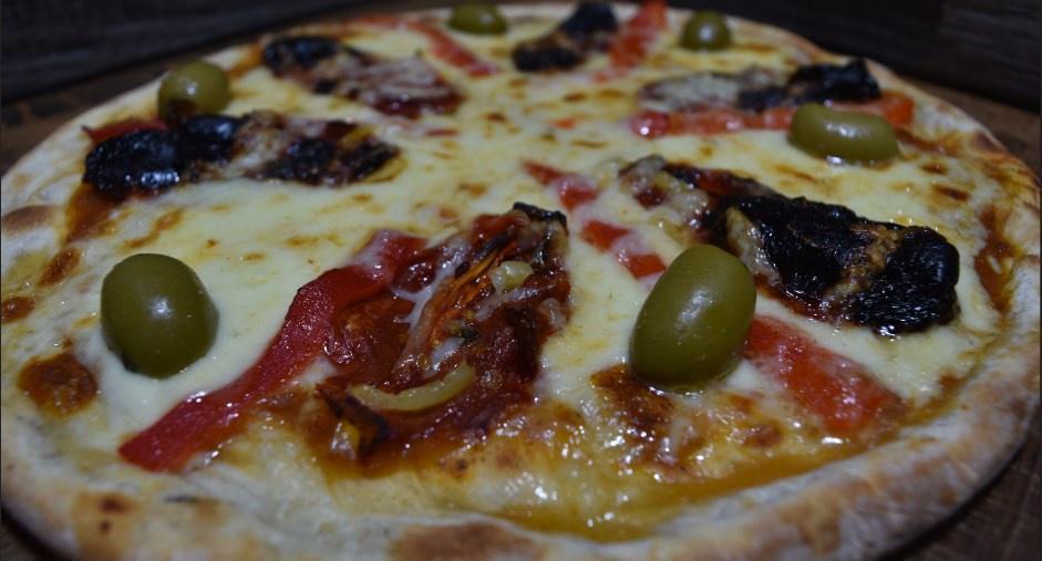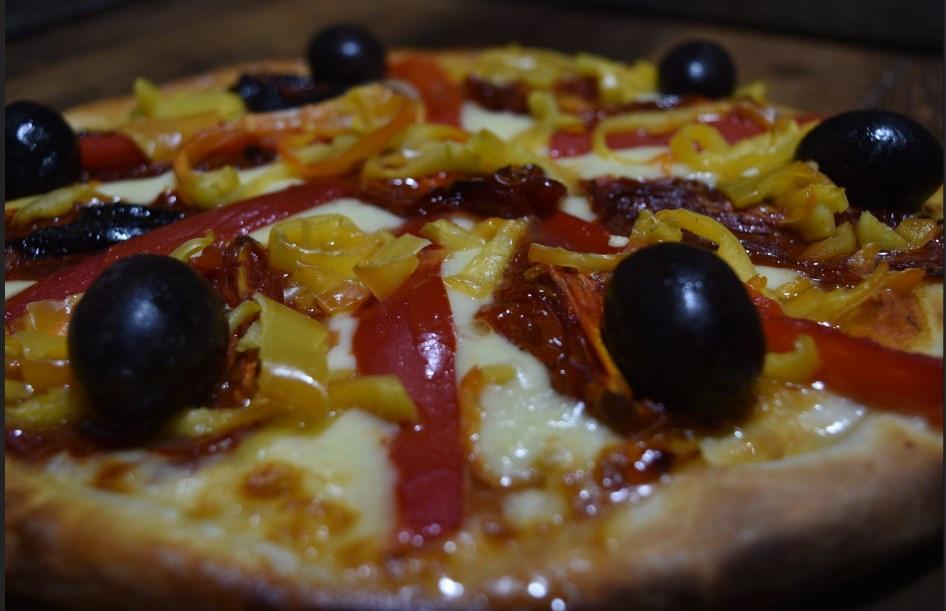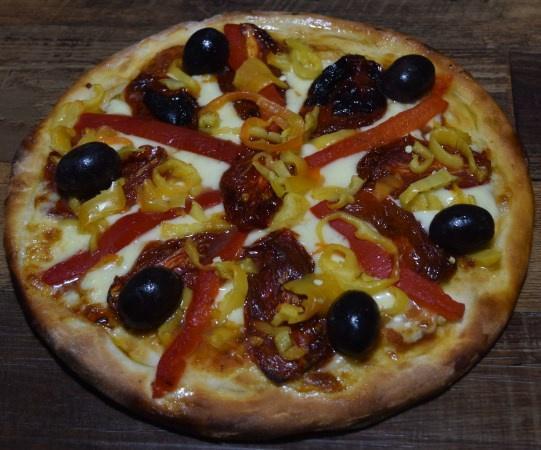 Salsa de tomate, muzzarella, tomates secos, ajíes verdes, morrones asados y aceitunas negras.