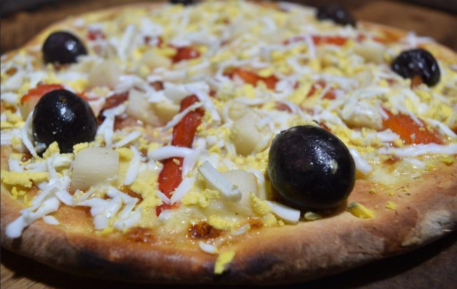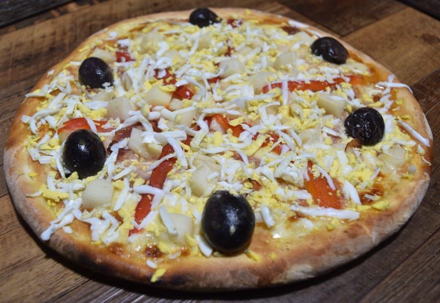 Salsa de tomate, muzzarella, panceta ahumada, palmitos, huevo duro, morrones asados y aceitunas negros.