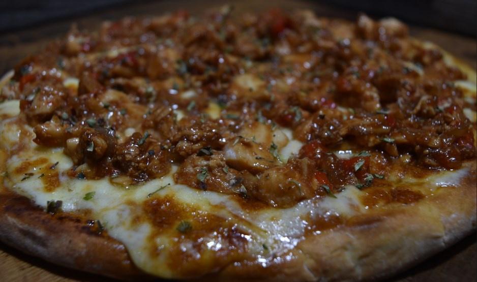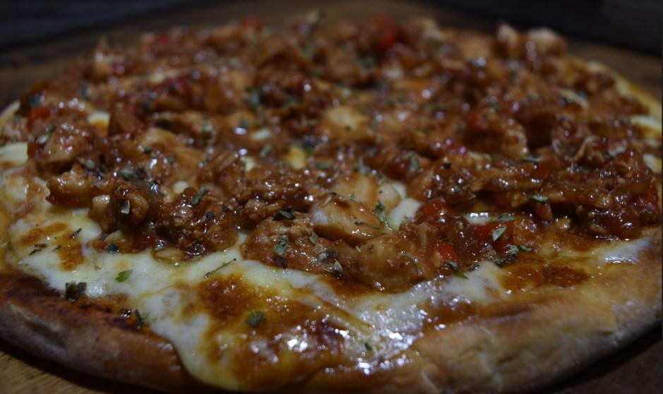 Salsa de tomate, muzzarella, cubos de pollo, salsa barbacoa y orégano.