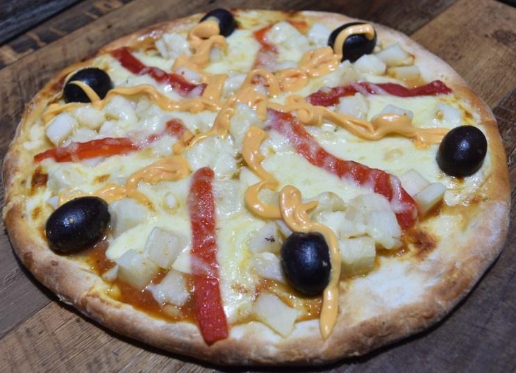 Salsa de tomate, muzzarella, papas fritas y aceitunas verdes.