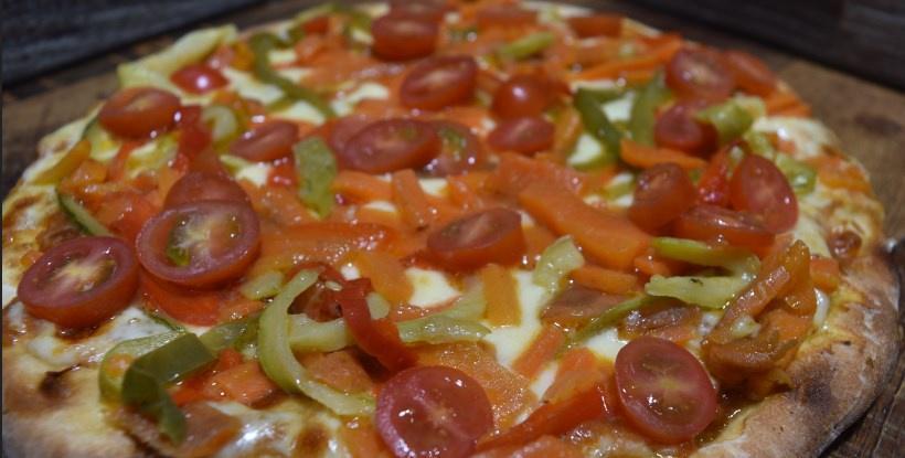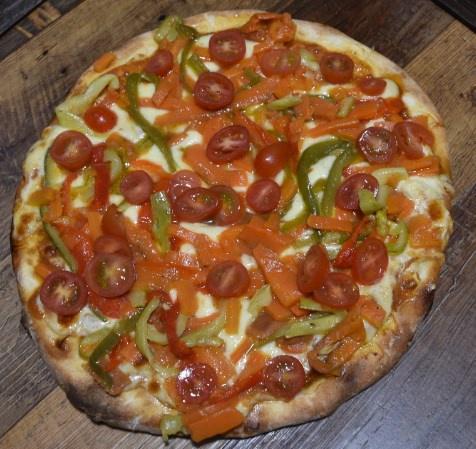 Salsa de tomate, muzzarella, juliana de morrones, zucchini, zanahoria y tomates cherry.