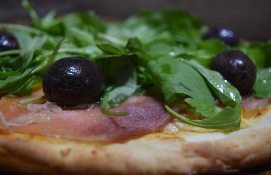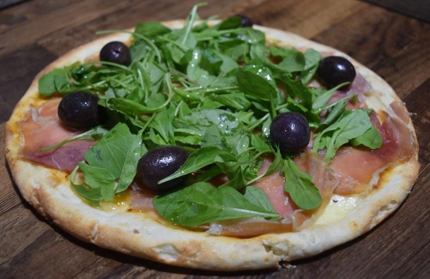 Salsa de tomate, muzzarella, jamón crudo, rúcula y aceitunas negras.