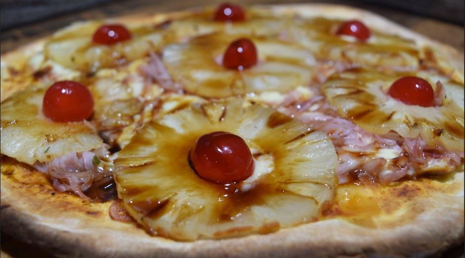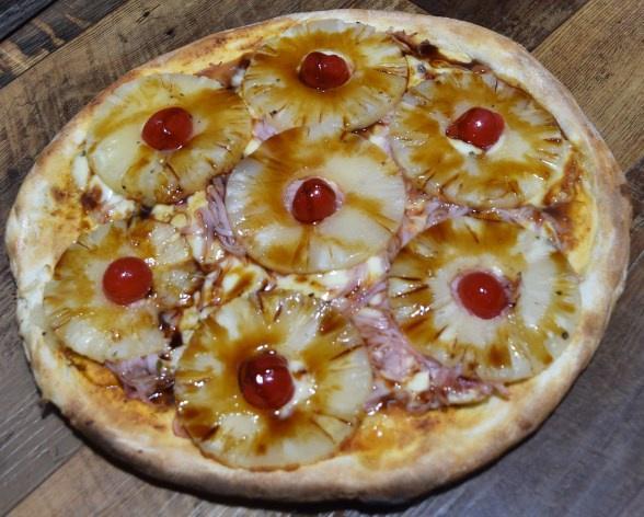Salsa de tomate, muzzarella, jamón cocido, cerezas, caramelo y ananá.