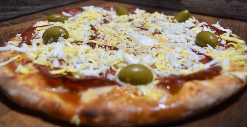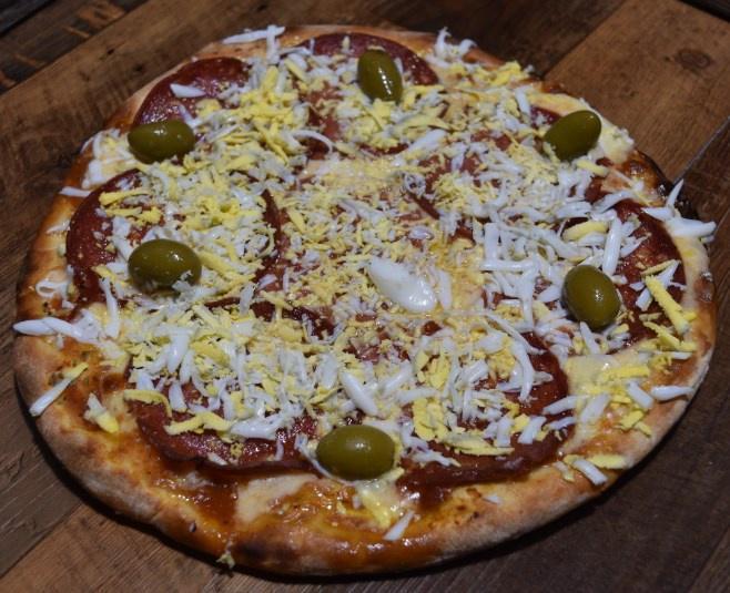 Salsa de tomate, muzzarella, cantimpalo, huevo duro y aceitunas verdes.