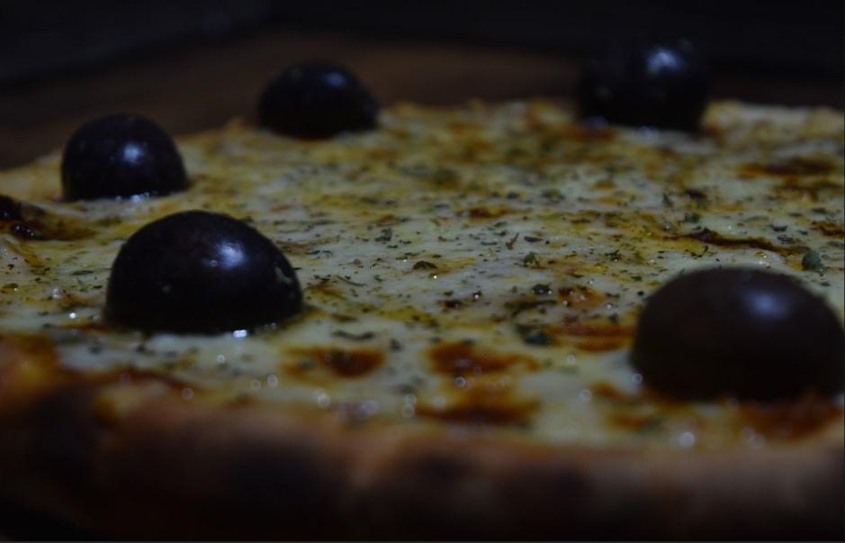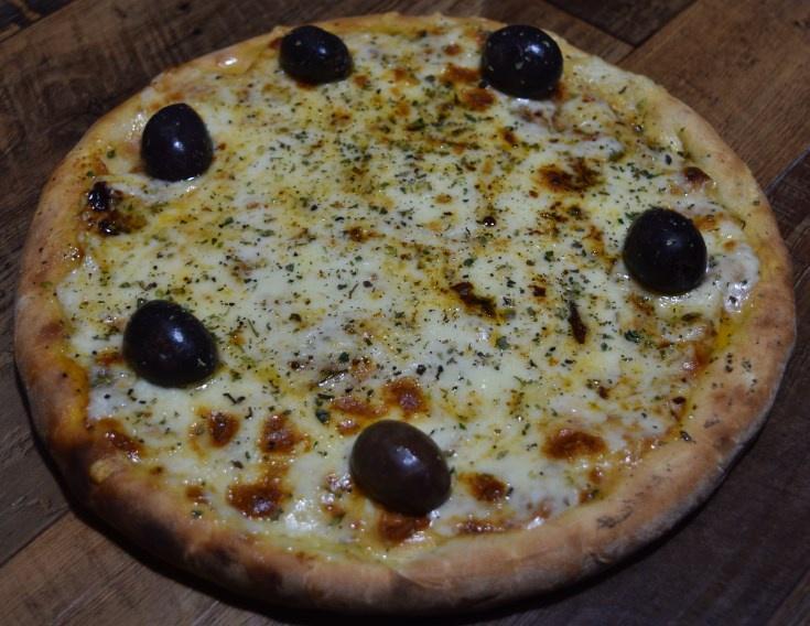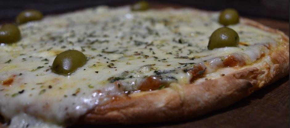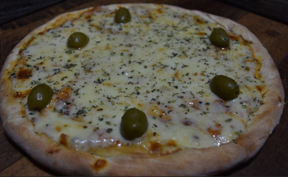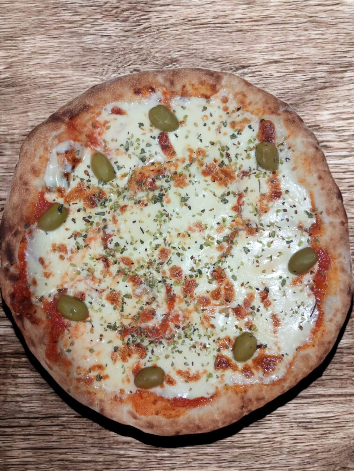 Salsa de tomate, muzzarella, orégano y aceitunas verdes.