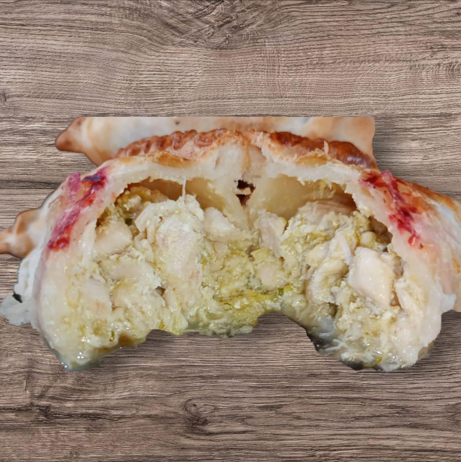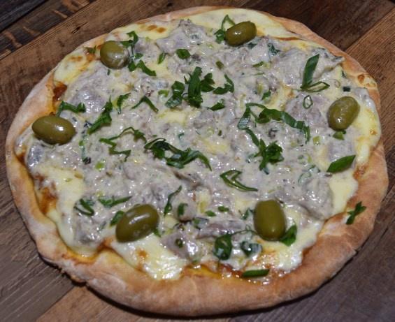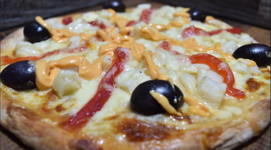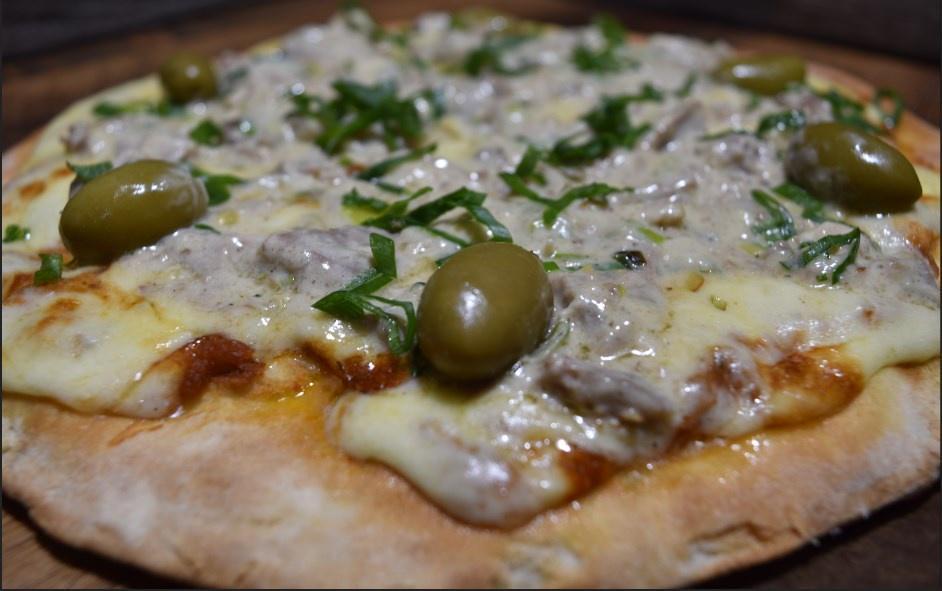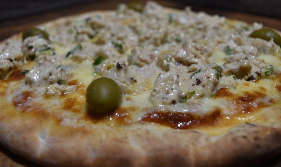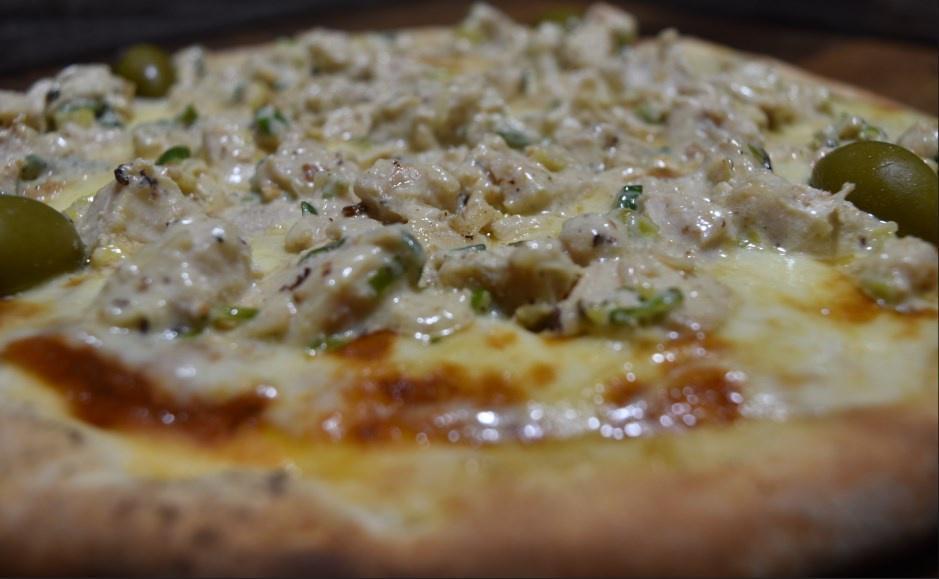 Salsa de tomate, muzzarella, pollo, crema, verdeo y aceitunas verdes.