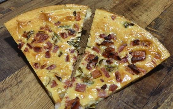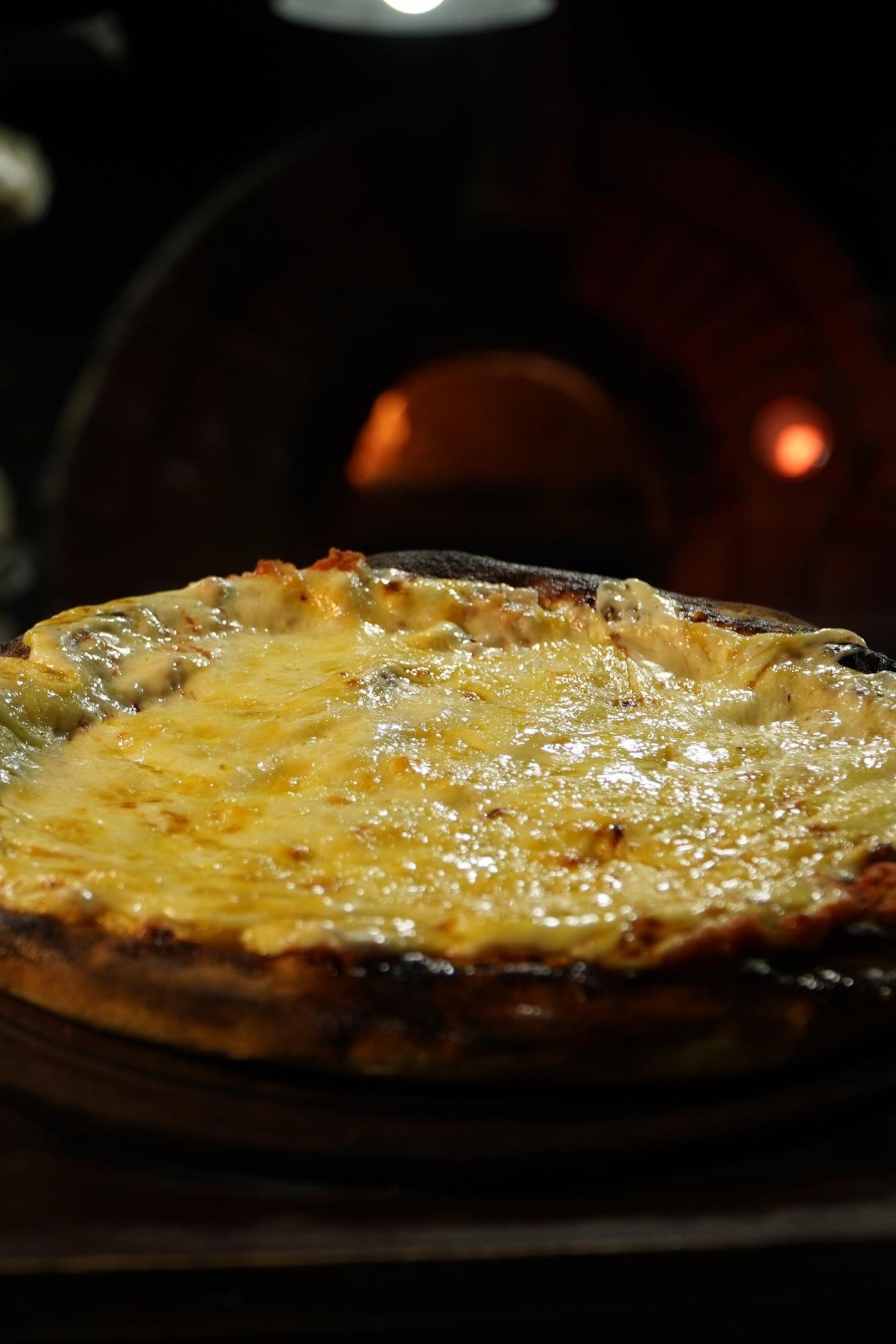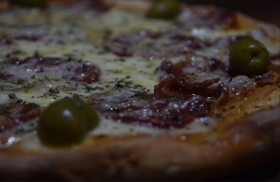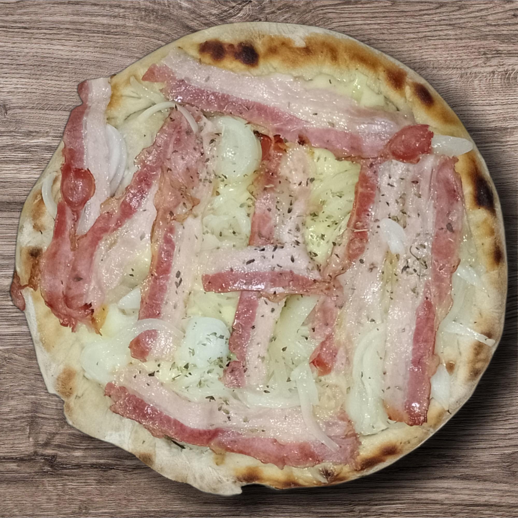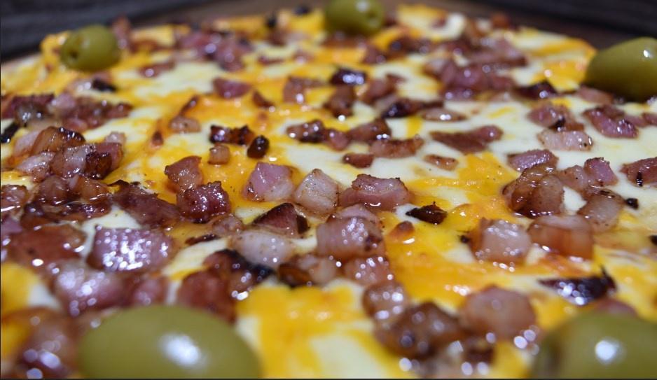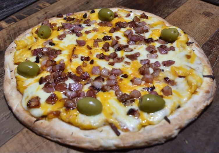 Salsa de tomate, muzzarella, cubitos de panceta dorada, cheddar y aceitunas verdes.