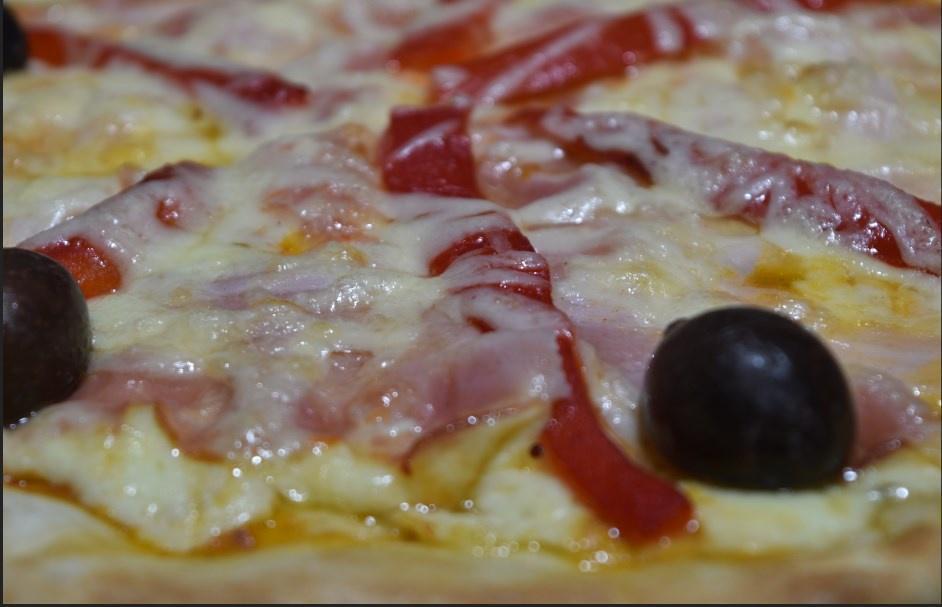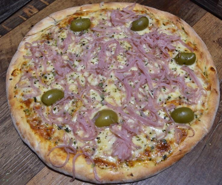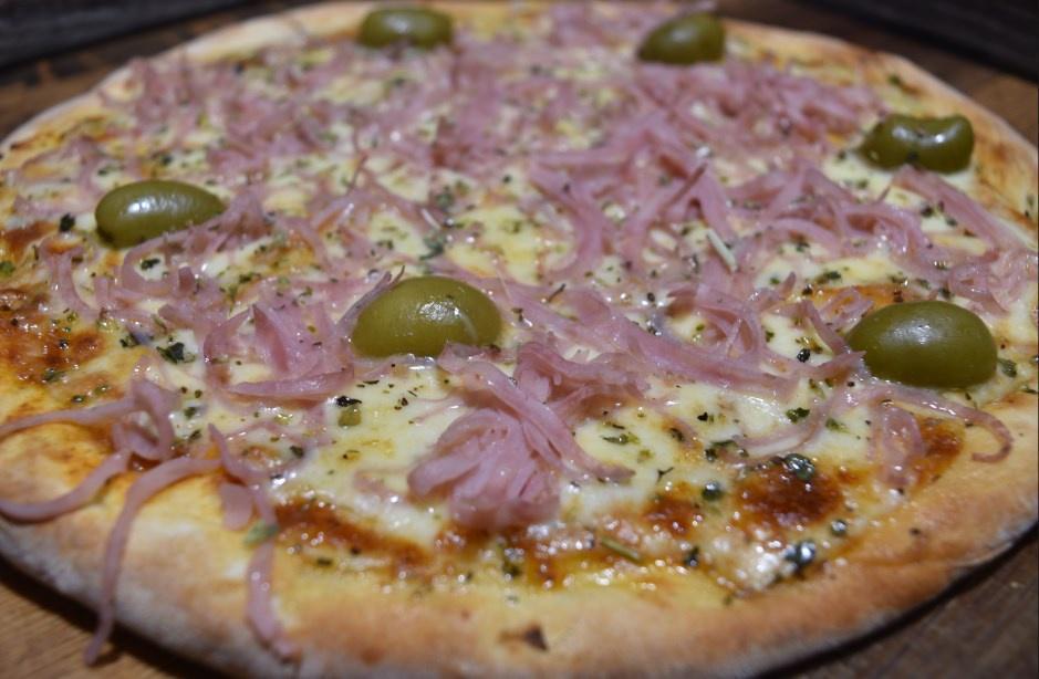 Salsa de tomate, muzzarella, jamón cocido, orégano y aceitunas verdes.