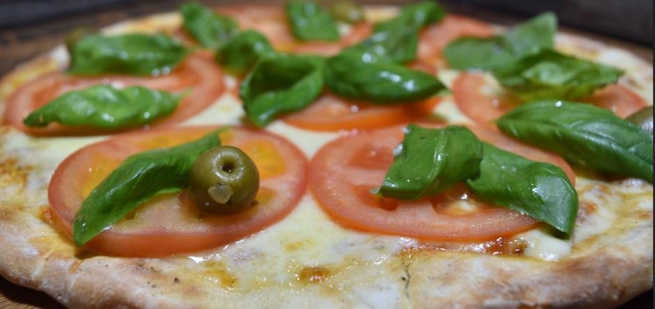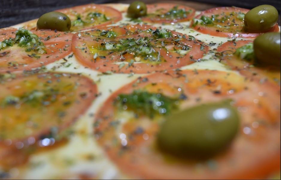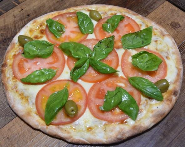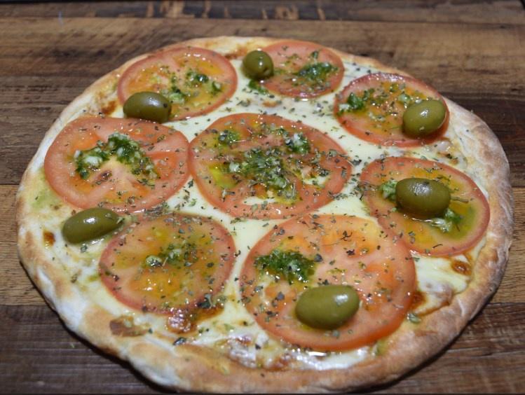 Salsa de tomate, muzzarella, rodajas de tomate, albahaca y aceitunas verdes.