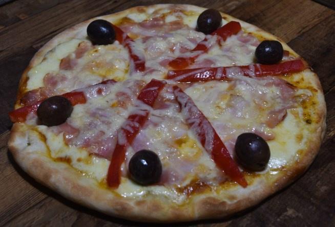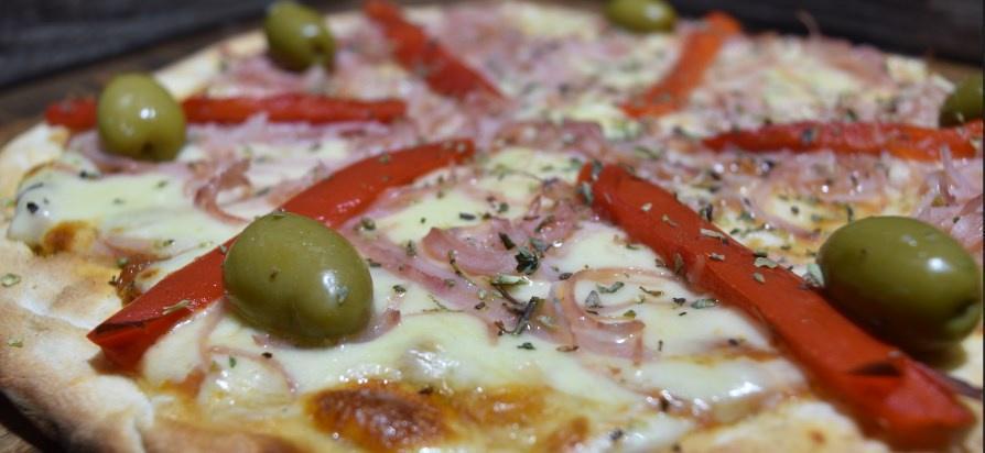 Salsa de tomate, muzzarella, jamón cocido, morrones asados, orégano y aceitunas verdes.