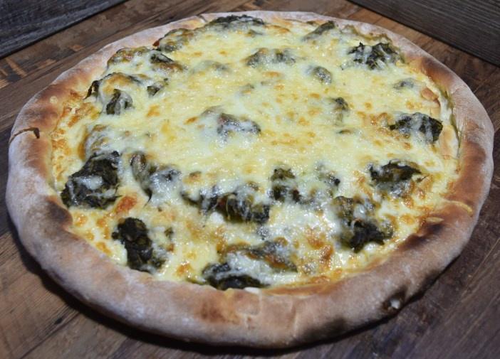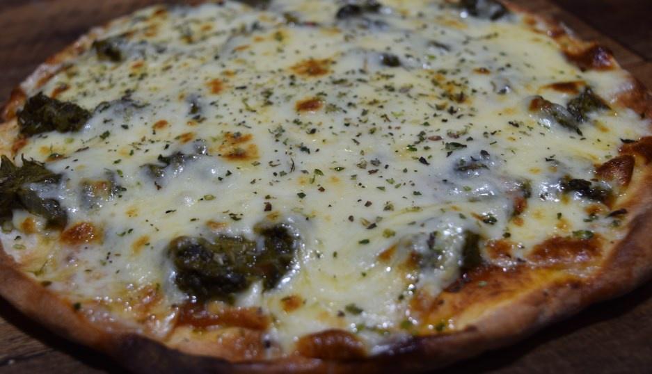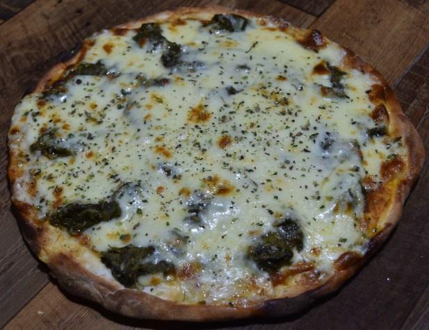 Salsa de tomate, muzzarella, cebolla rehogada, espinaca, morrones asados y queso parmesano.