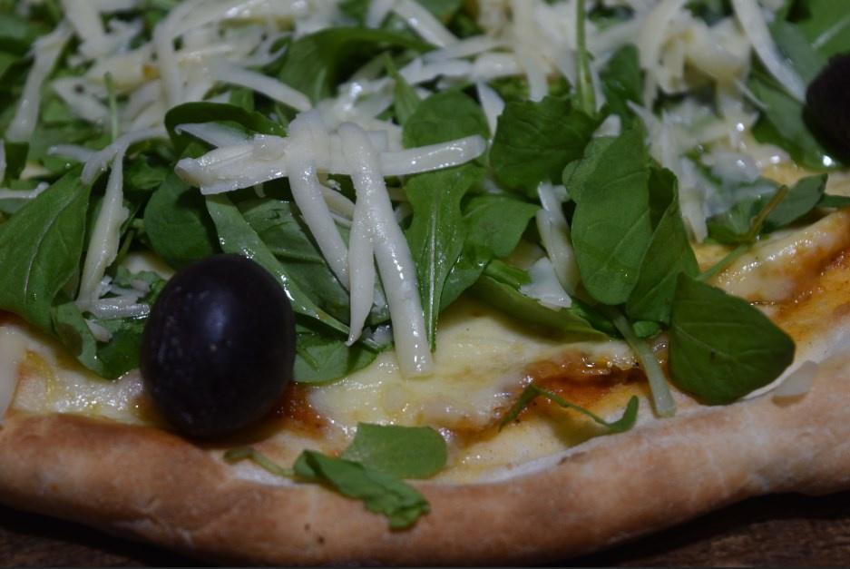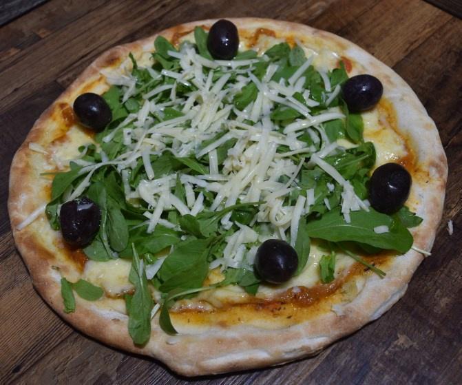 Salsa de tomate, muzzarella, queso parmesano, rúcula y aceitunas negras.