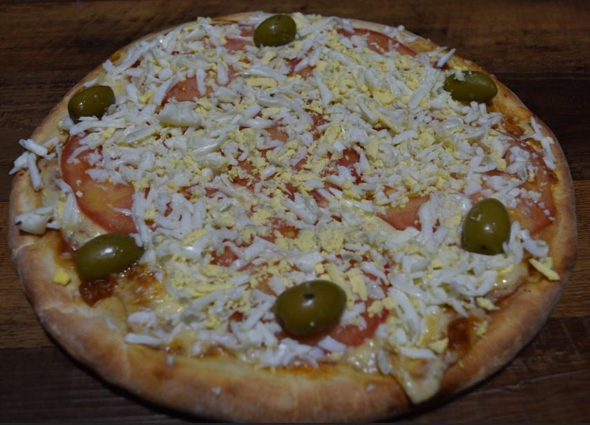 Salsa de tomate, muzzarella, rodajas de tomate, huevo duro y aceitunas verdes.