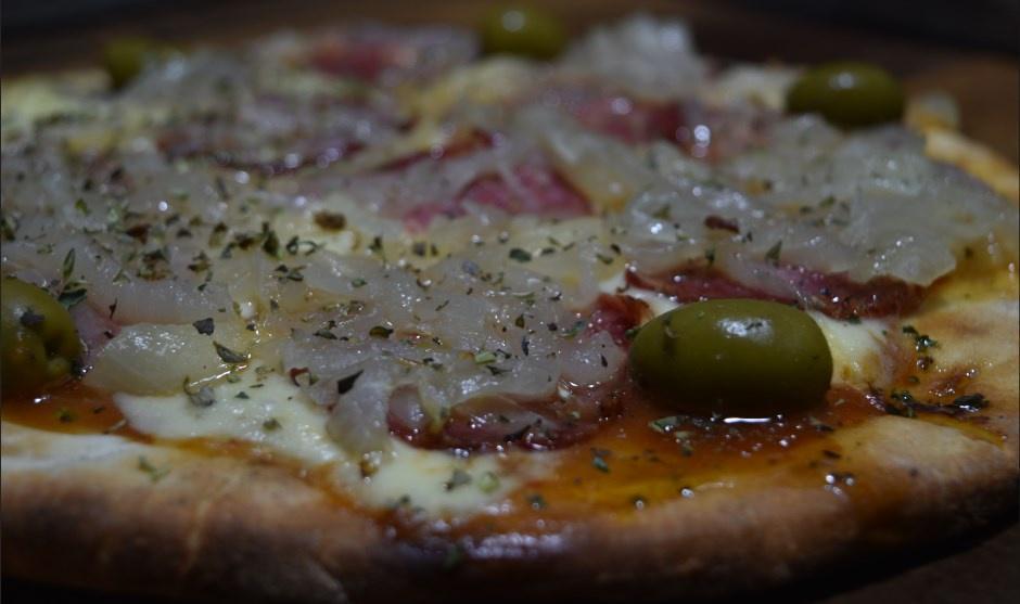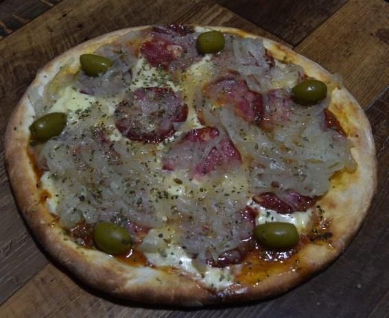 Salsa de tomate, muzzarella, longaniza, cebolla rehogada, orégano y aceitunas verdes.