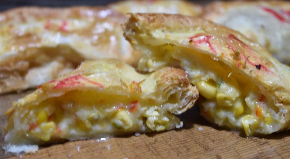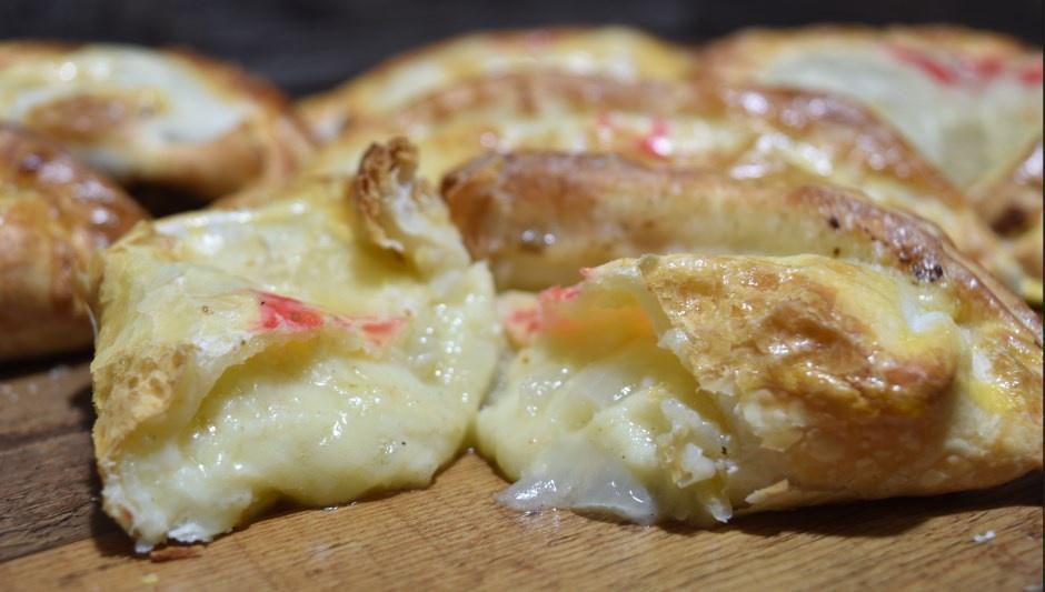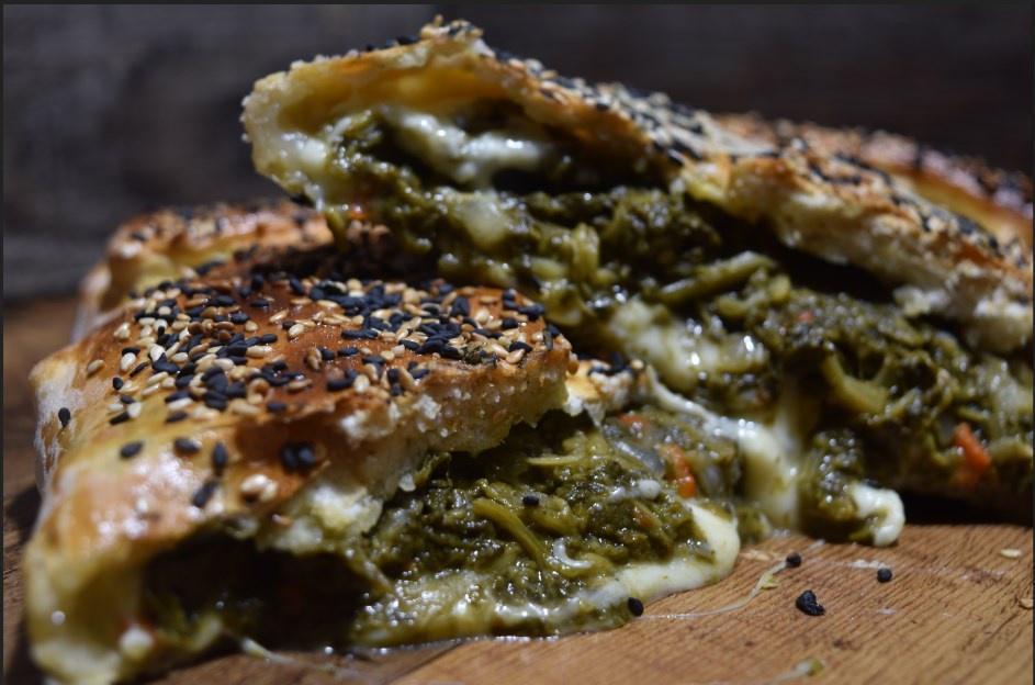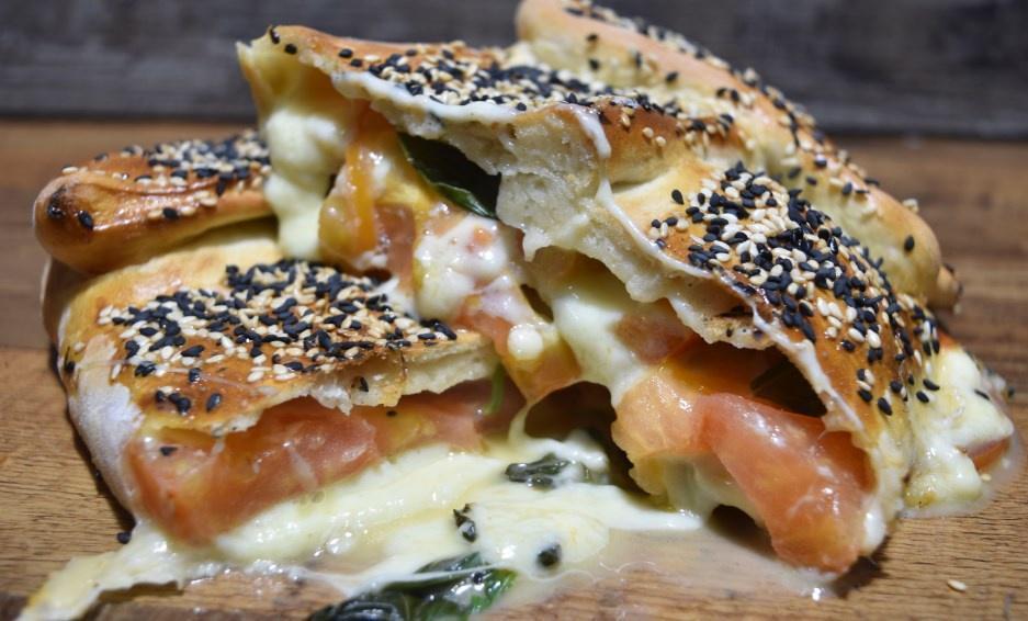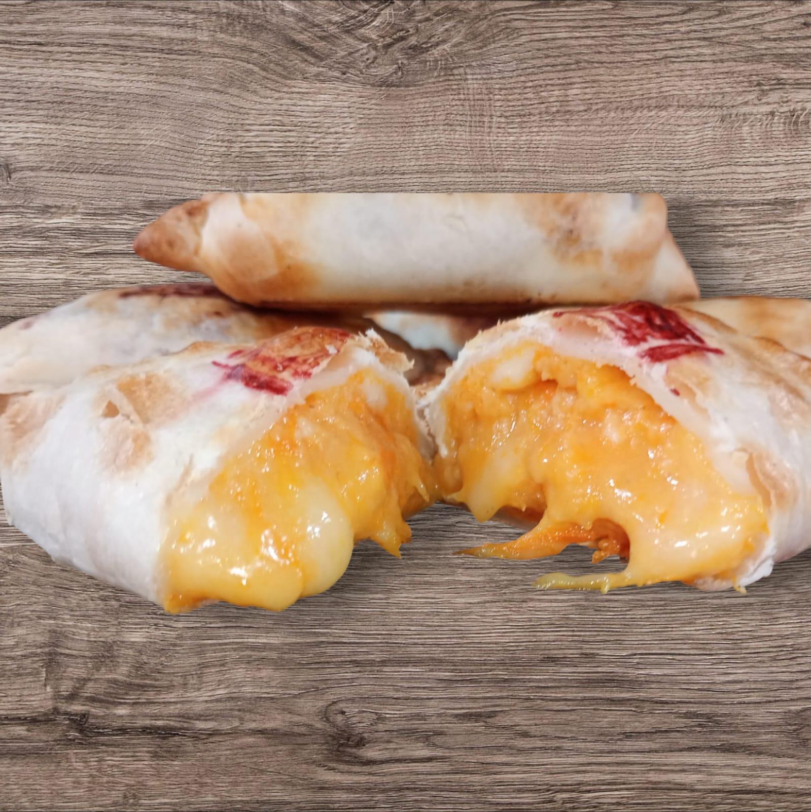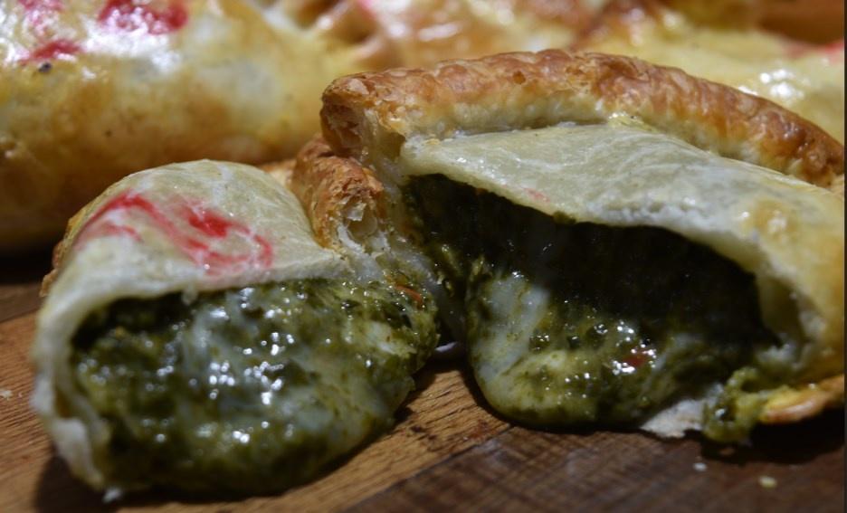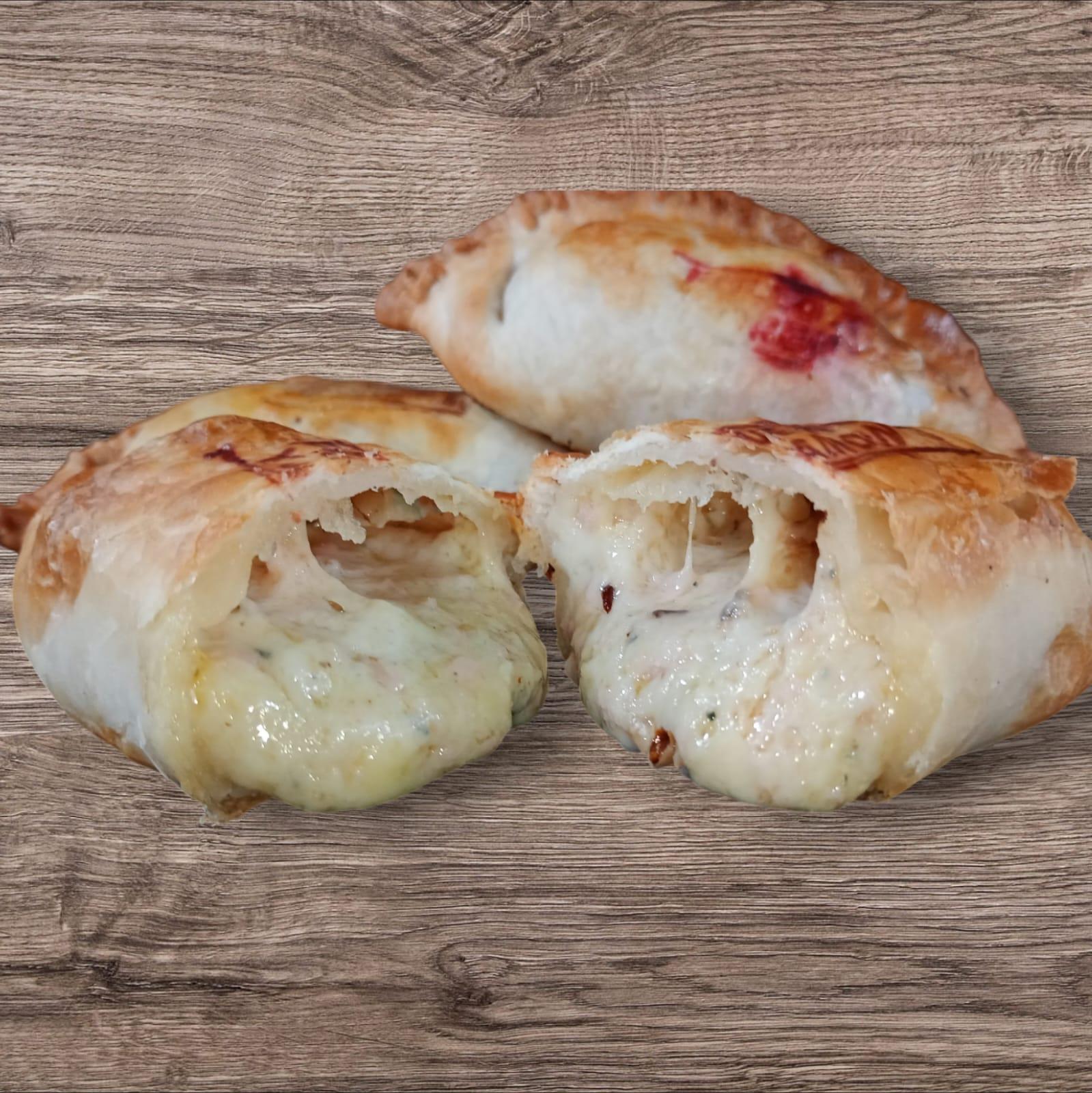 Por dentro muzzarella, espinaca salteada con cebolla y morrones asados.Por fuera muzzarella y espinaca.