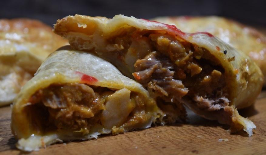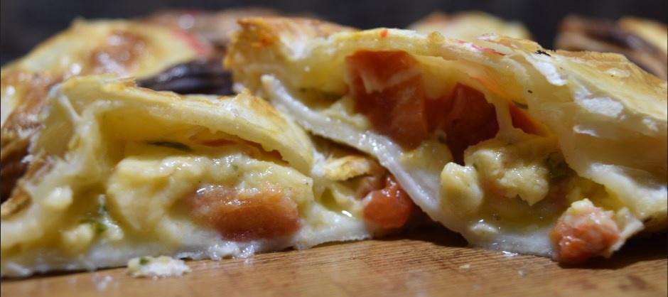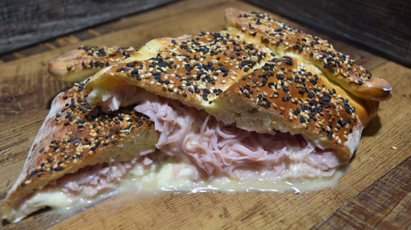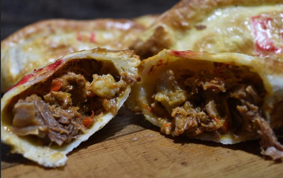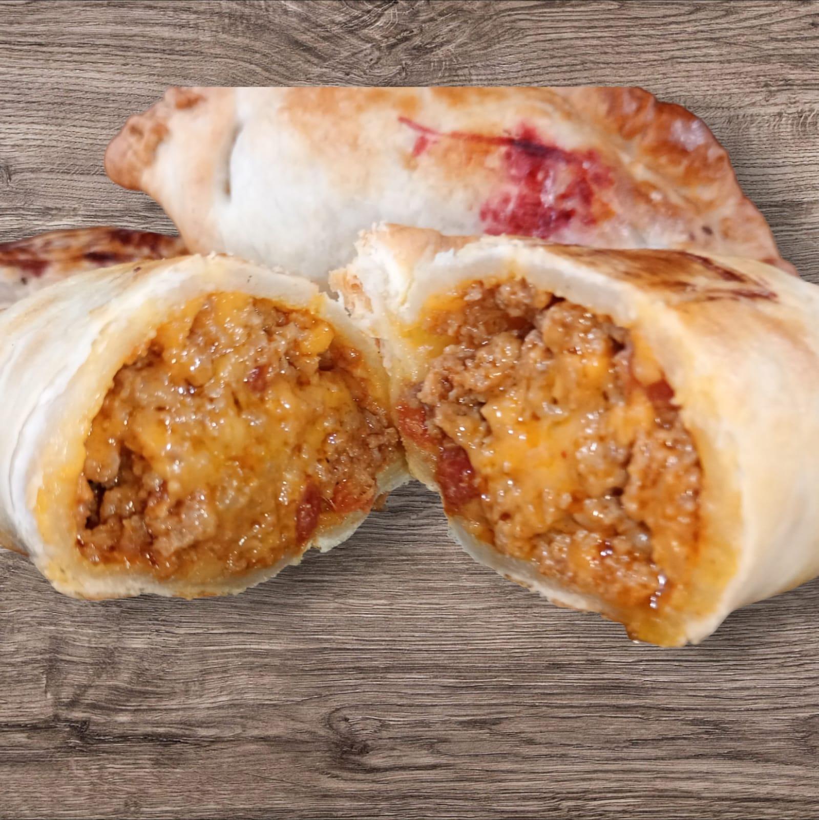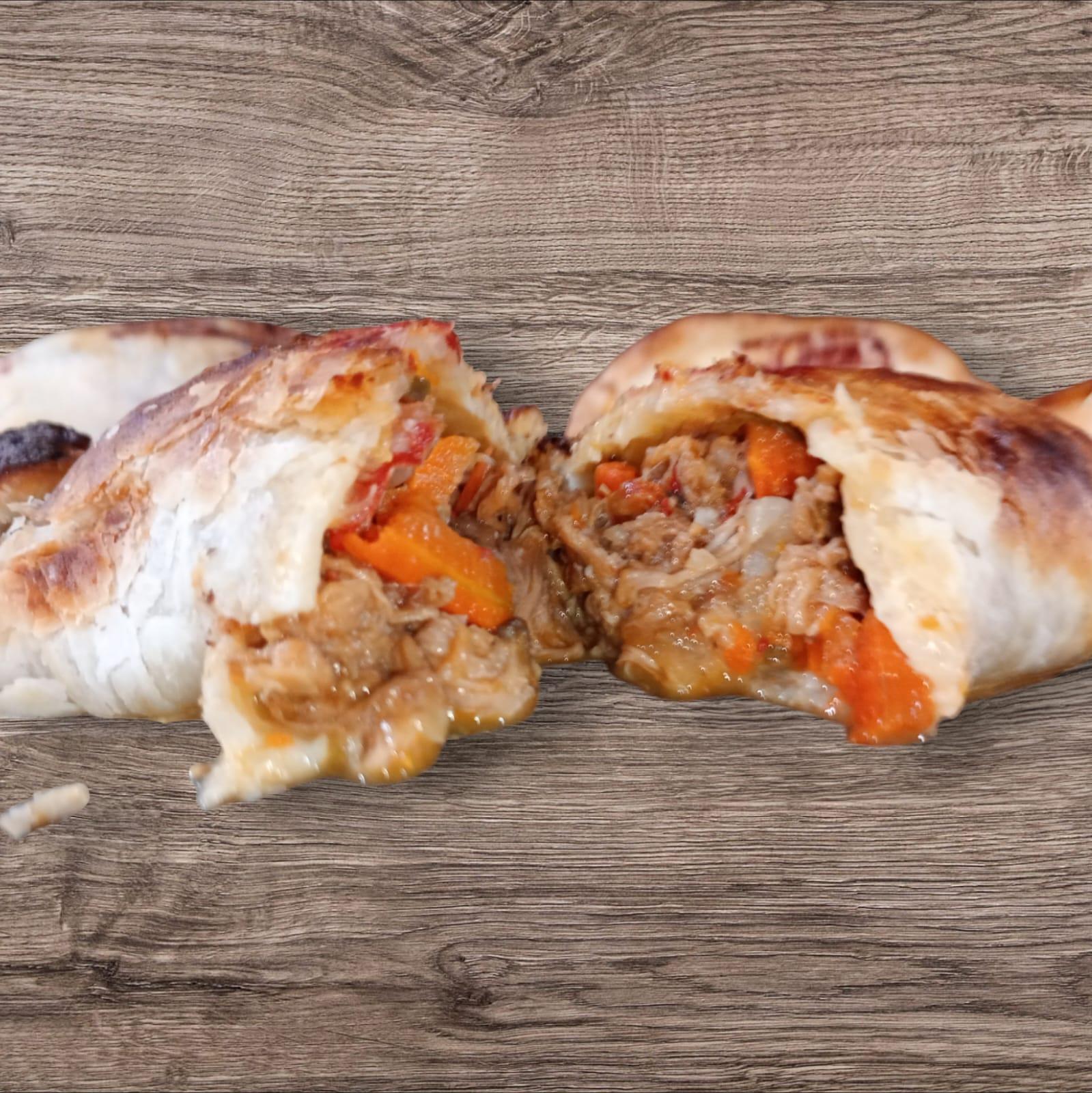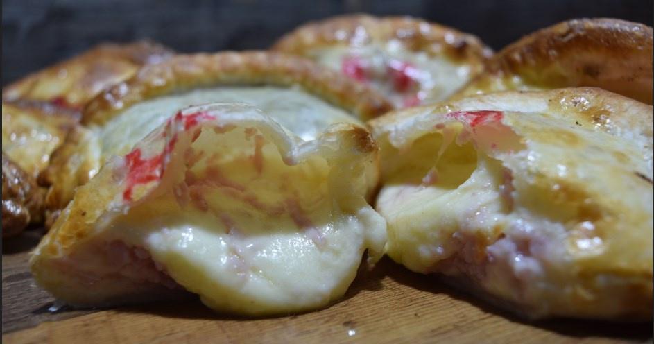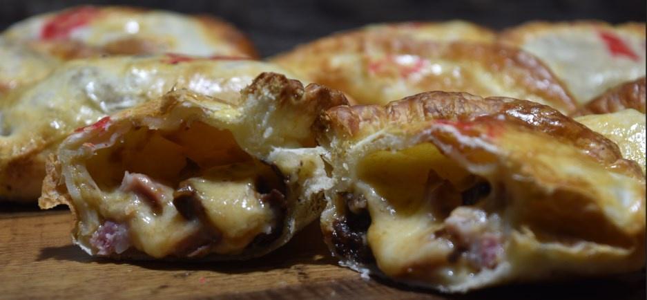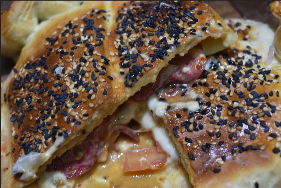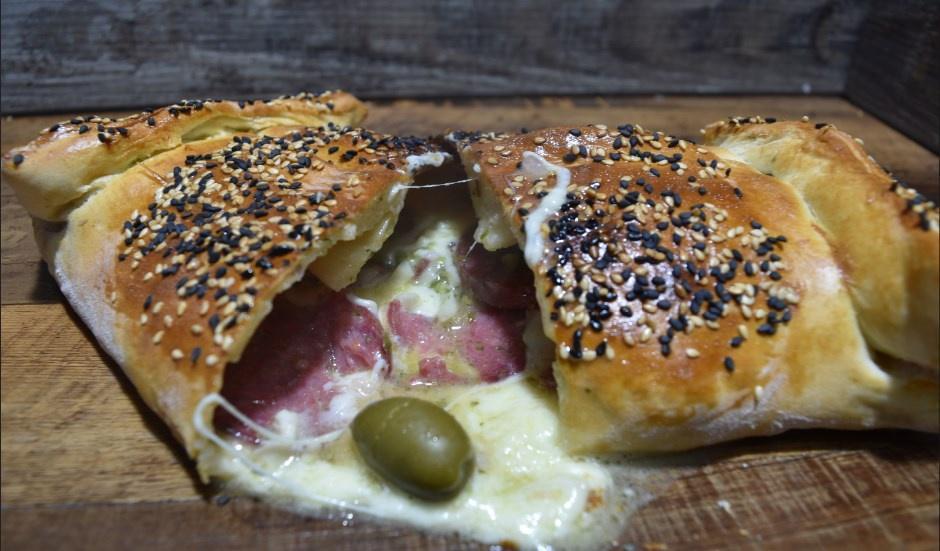 Por dentro:muzzarella,panceta ahumada, morrones asados. Por fuera:Muzarella,Panceta Ahumada, Cebolla rehogada