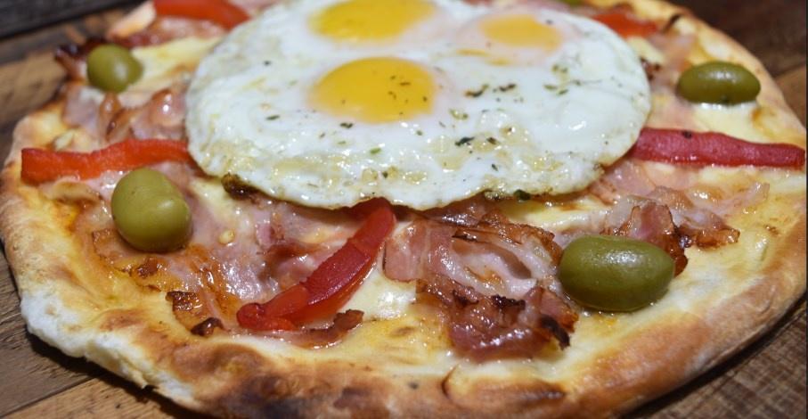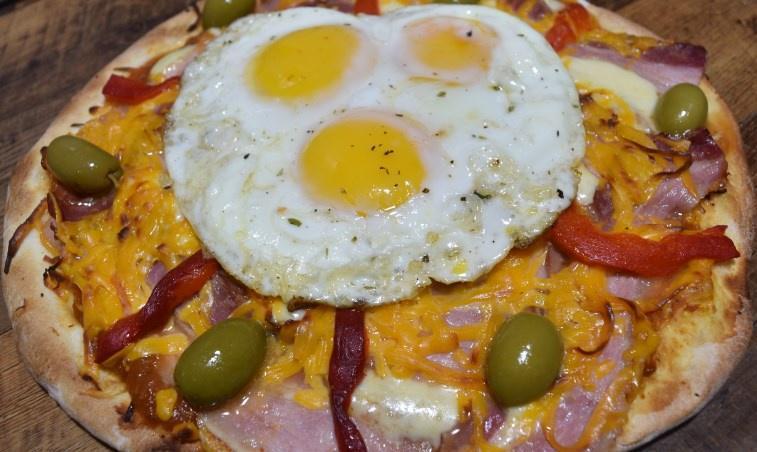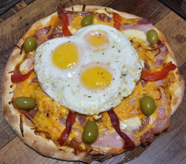 Salsa de tomate, muzzarella, panceta ahumada, queso cheddar, morrones asados, huevos fritos y aceitunas verdes.