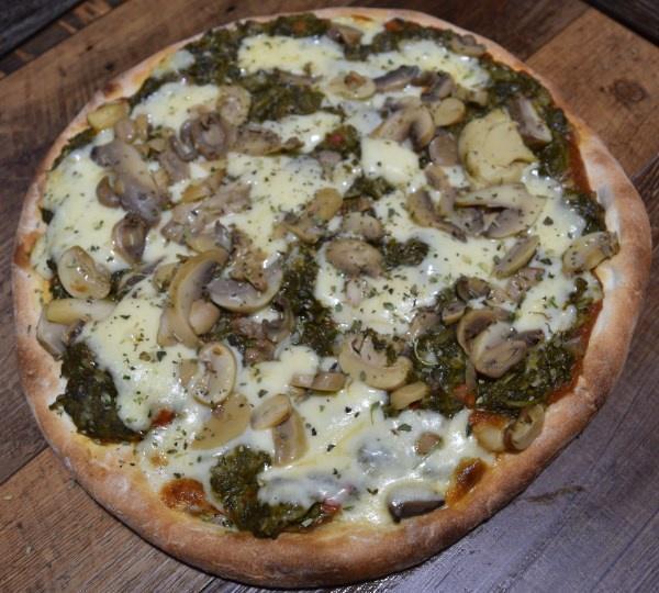 Salsa de tomate, muzzarella, espinaca, champignones, cebolla rehogada, morrones asados, provolone y tomates cherry.