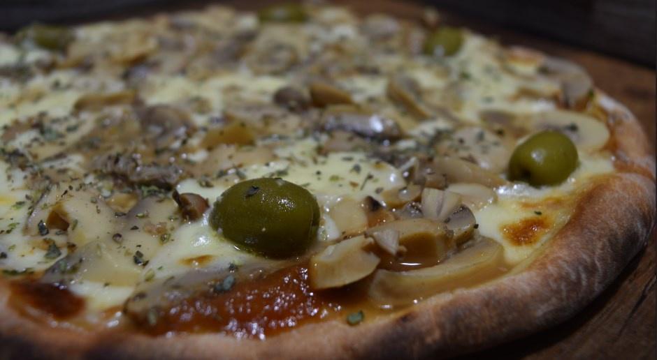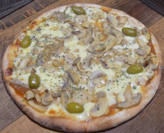 Salsa de tomate, muzzarella, champignones,oregano y aceitunas verdes.