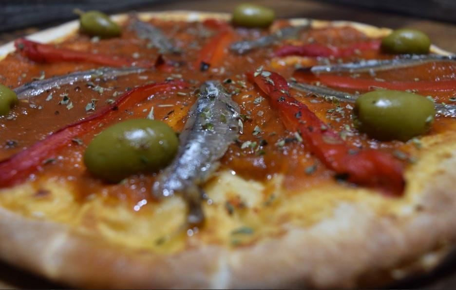 Salsa de tomate, anchoas, morrones asados y aceitunas verdes.
