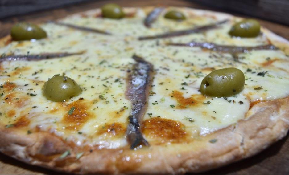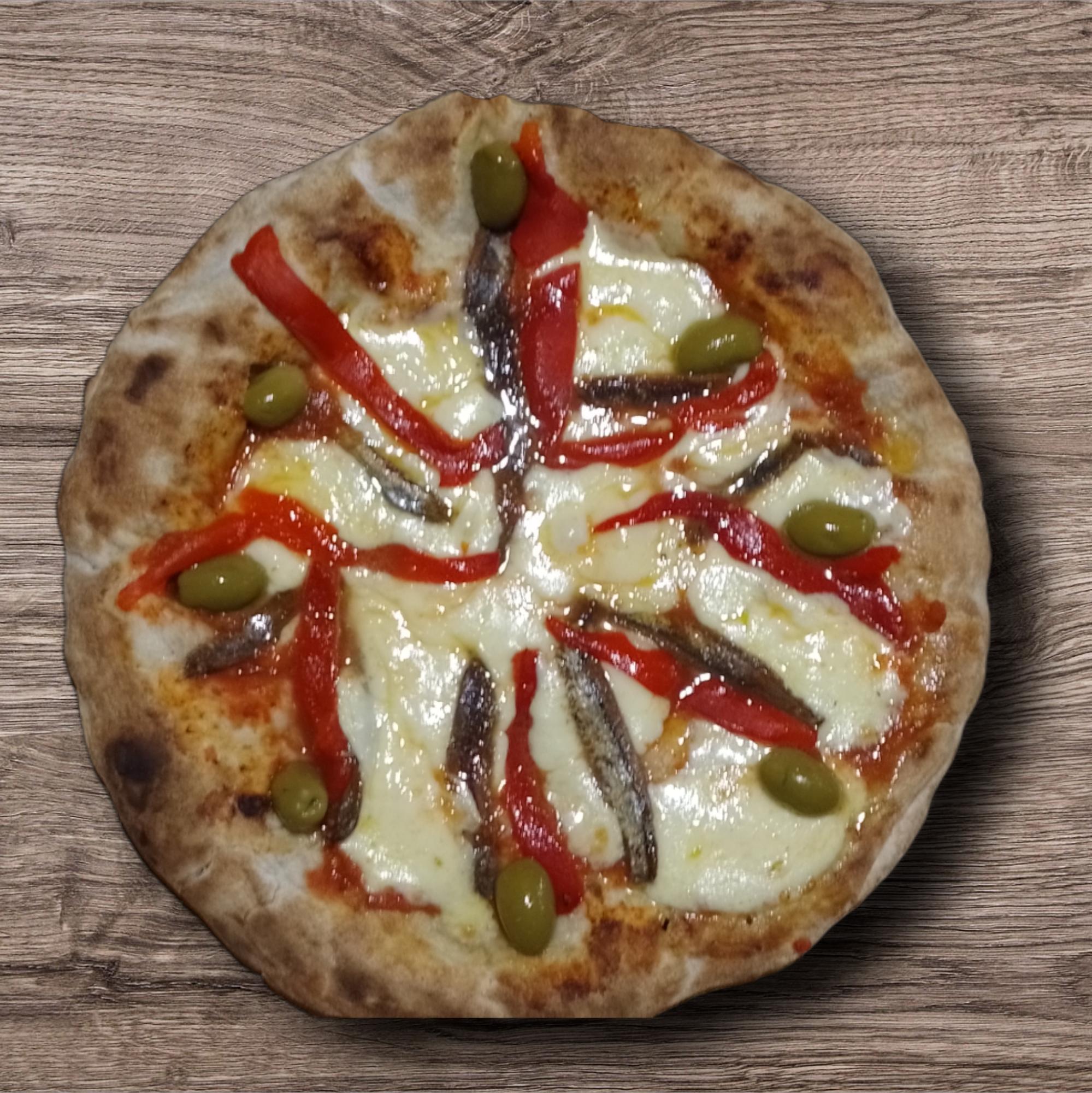 Salsa de tomate, muzzarella, anchoas, morrones asados y aceitunas verdes.