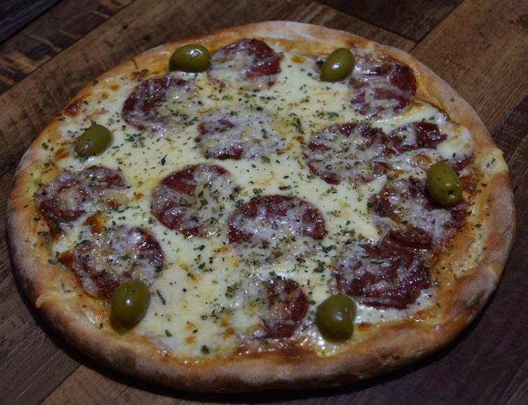 Salsa de tomate, muzzarella, longaniza, queso parmesano, orégano y aceitunas verdes.