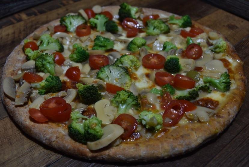 Salsa de tomate, muzzarella, brocoli blanqueados, champignones laminados, tomates cherry y aceite de oliva