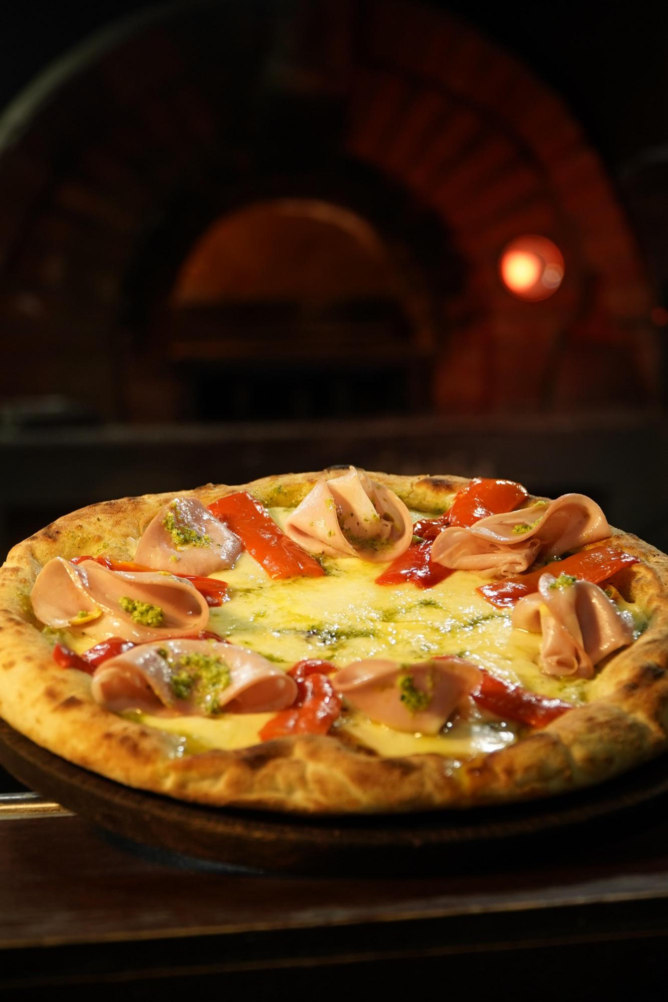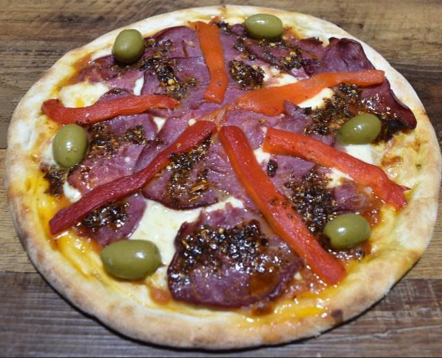 Salsa de tomate, muzzarella, fiambre de vacio ahumado,morrones asados,chimichurry y aceitunas verdes