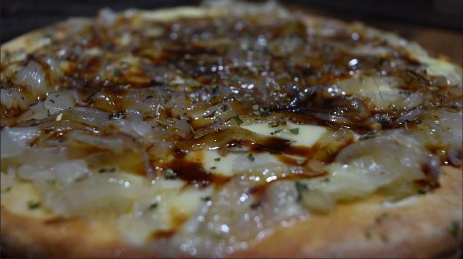 Cebolla rehogada, muzzarella, caramelo liquido, aceitunas verdes.