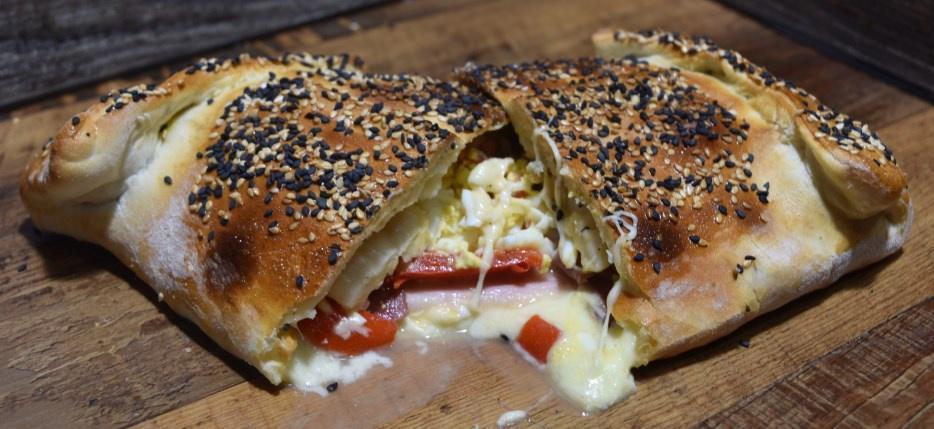Por dentro:Muzzarella,Panceta ahumada, queso cheddar, morrones asados. Por Fuera:muzarella,panceta ahumada, 6 huevos fritos