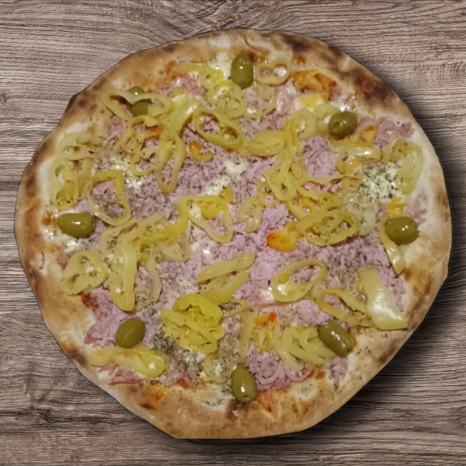 Salsa de tomate, muzzarella, jamón cocido, ajíes en vinagres, orégano y aceitunas verdes.