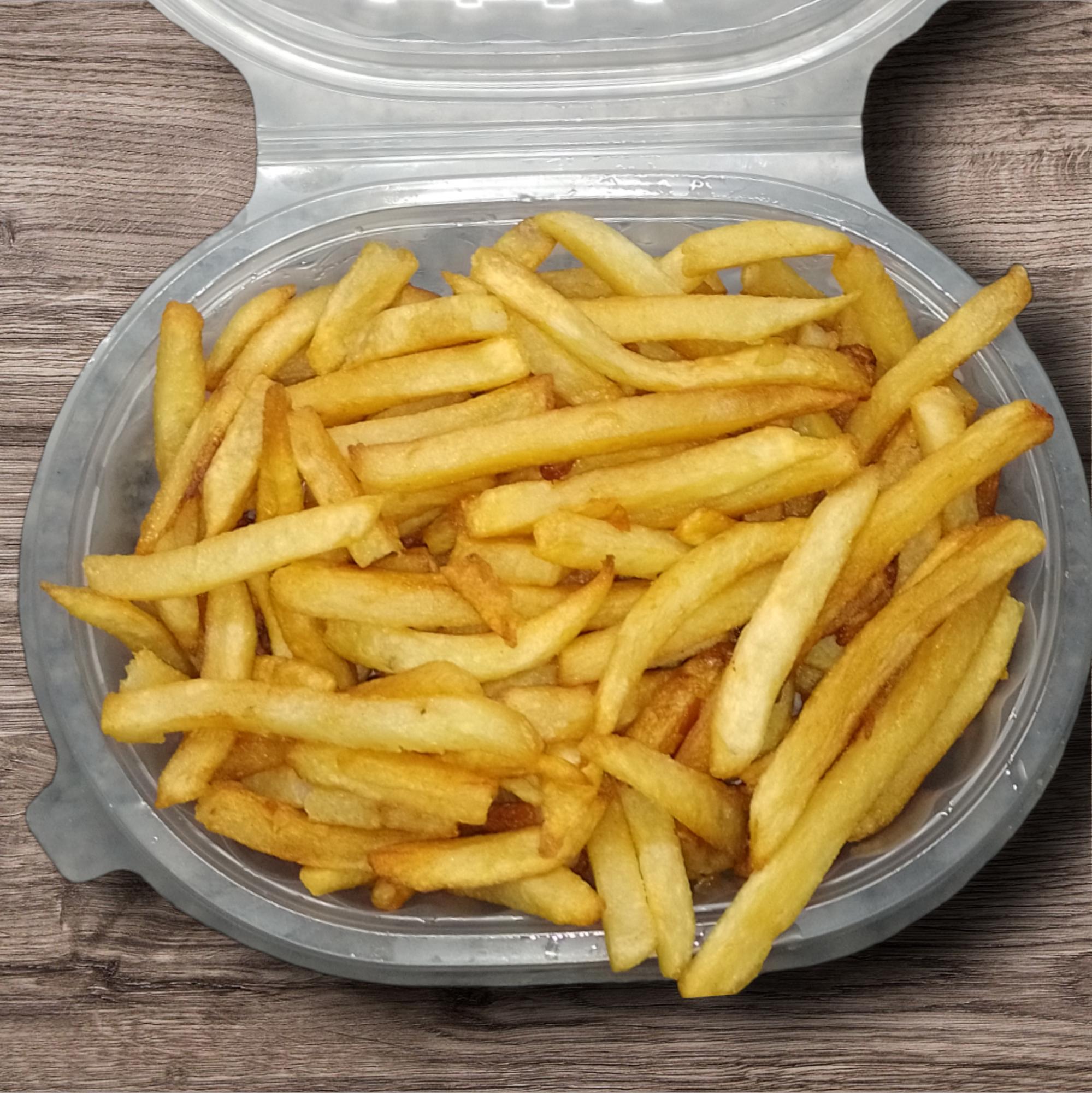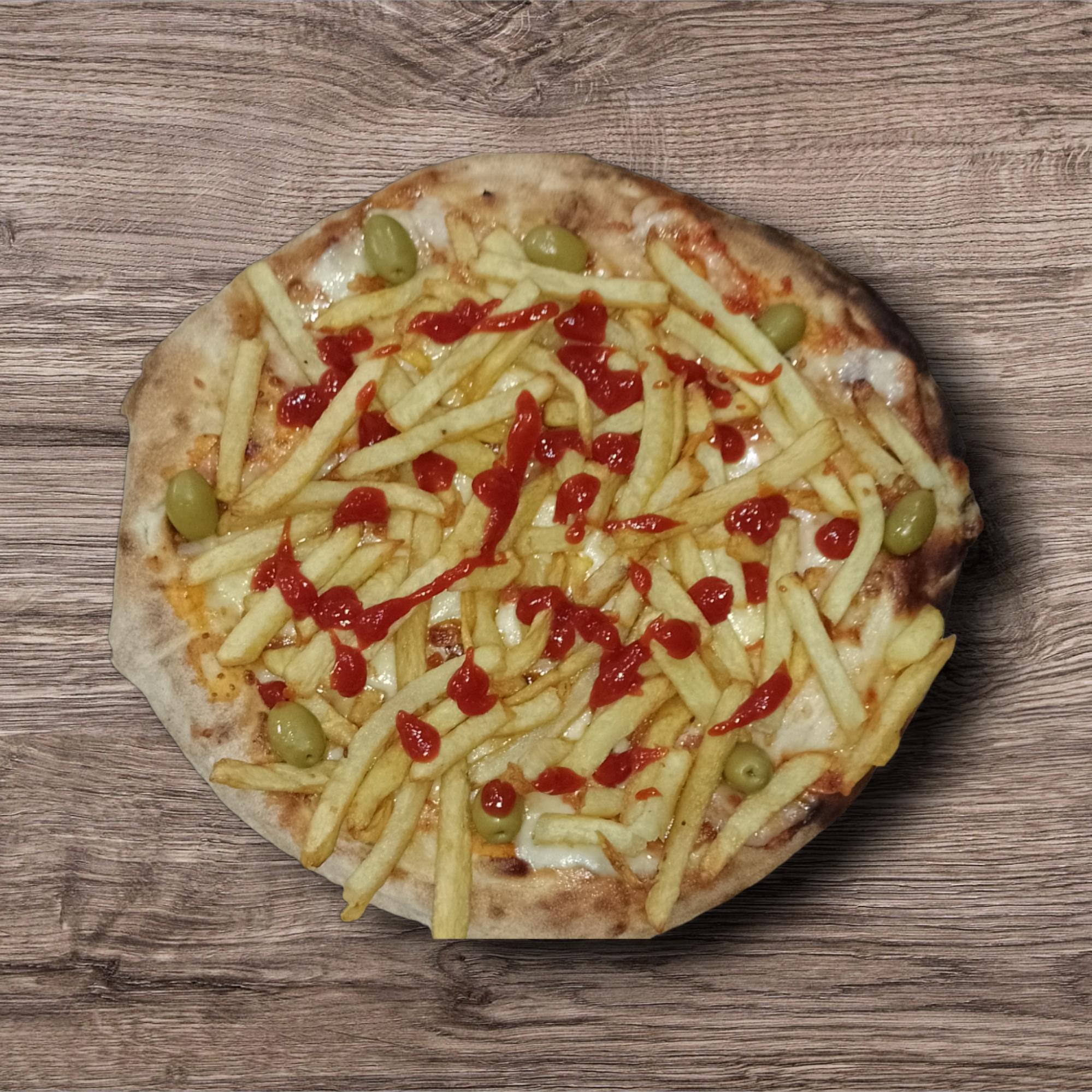 Salsa de tomate, muzzarella, papas fritas, ketchup y aceitunas verdes.
