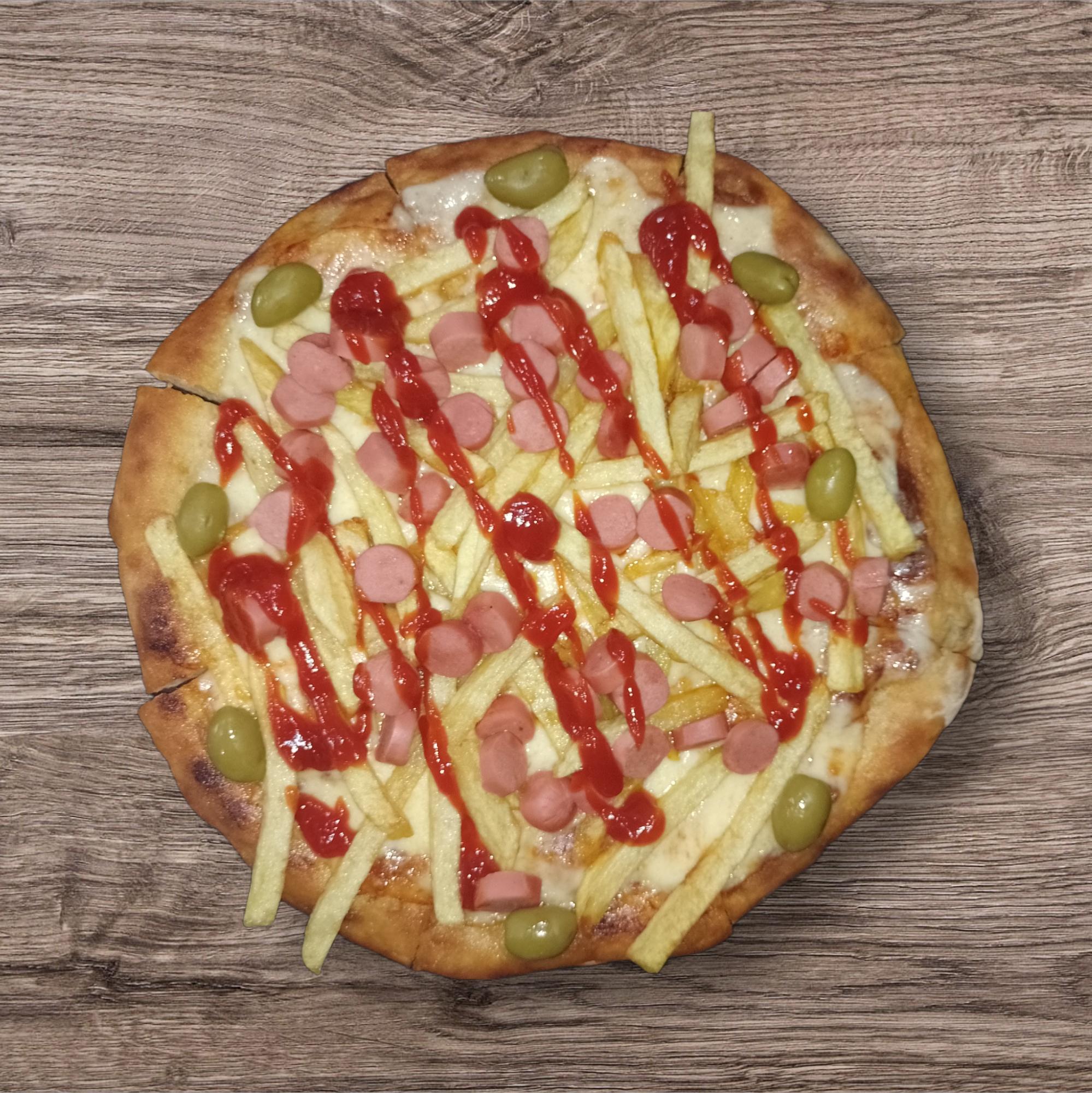 Salsa de tomate, muzzarella, salchicha de viena, papas fritas, ketchup y aceitunas verdes.