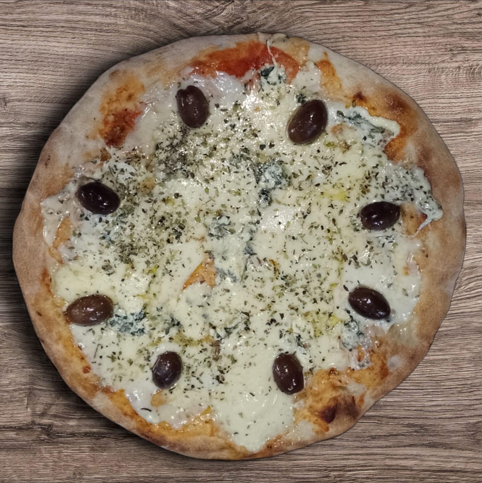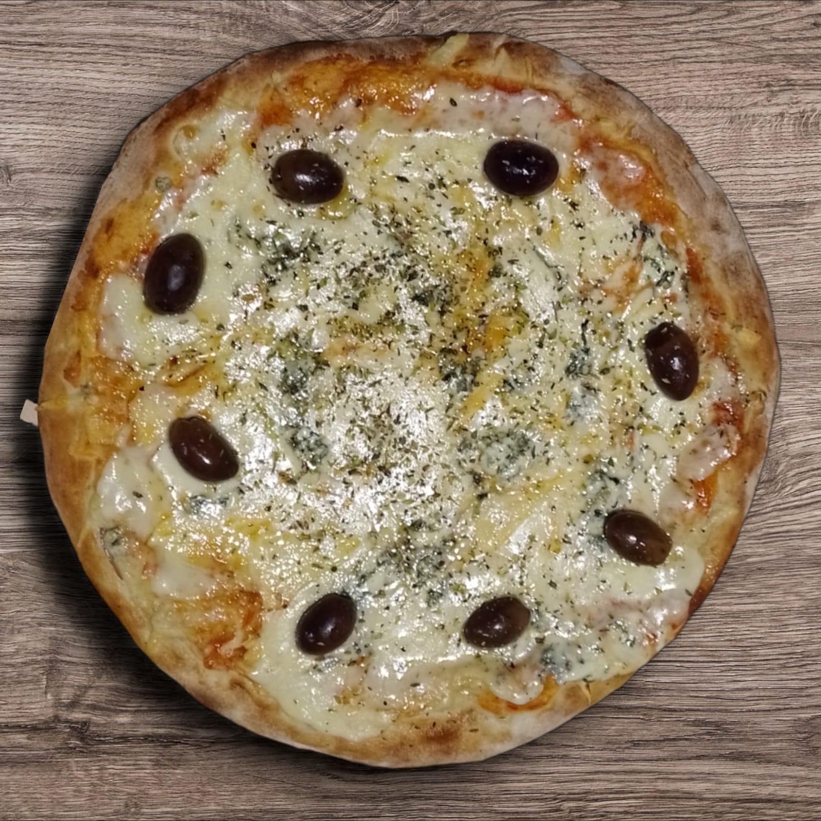 Salsa de tomate, muzzarella, roquefort, sardo, parmesano, oregano y aceitunas verdes.