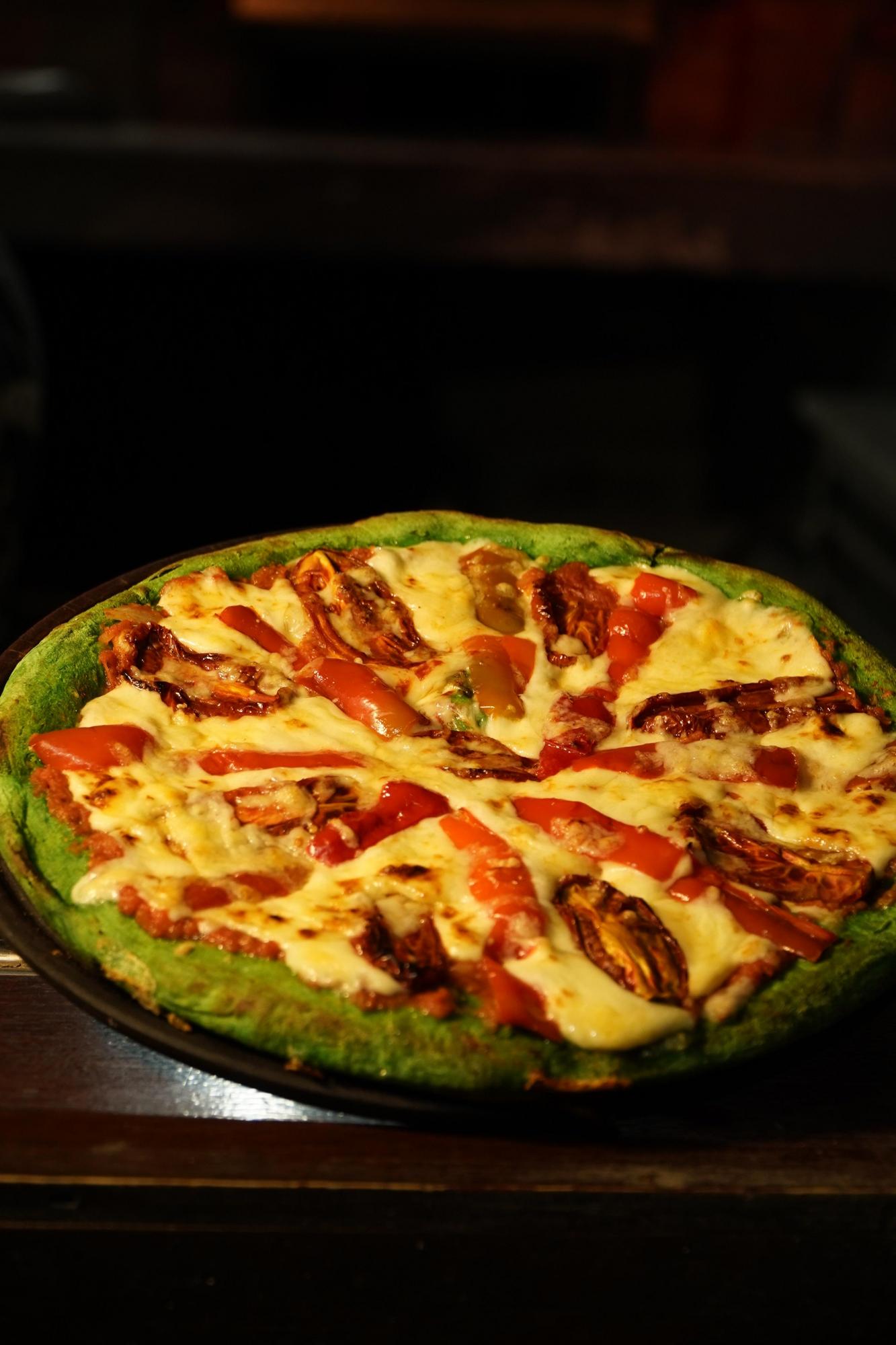 (Masa a base de espinaca )Salsa de tomate, muzarella, tomates secos, provolone gratinado, morrones y aceitunas verdes.