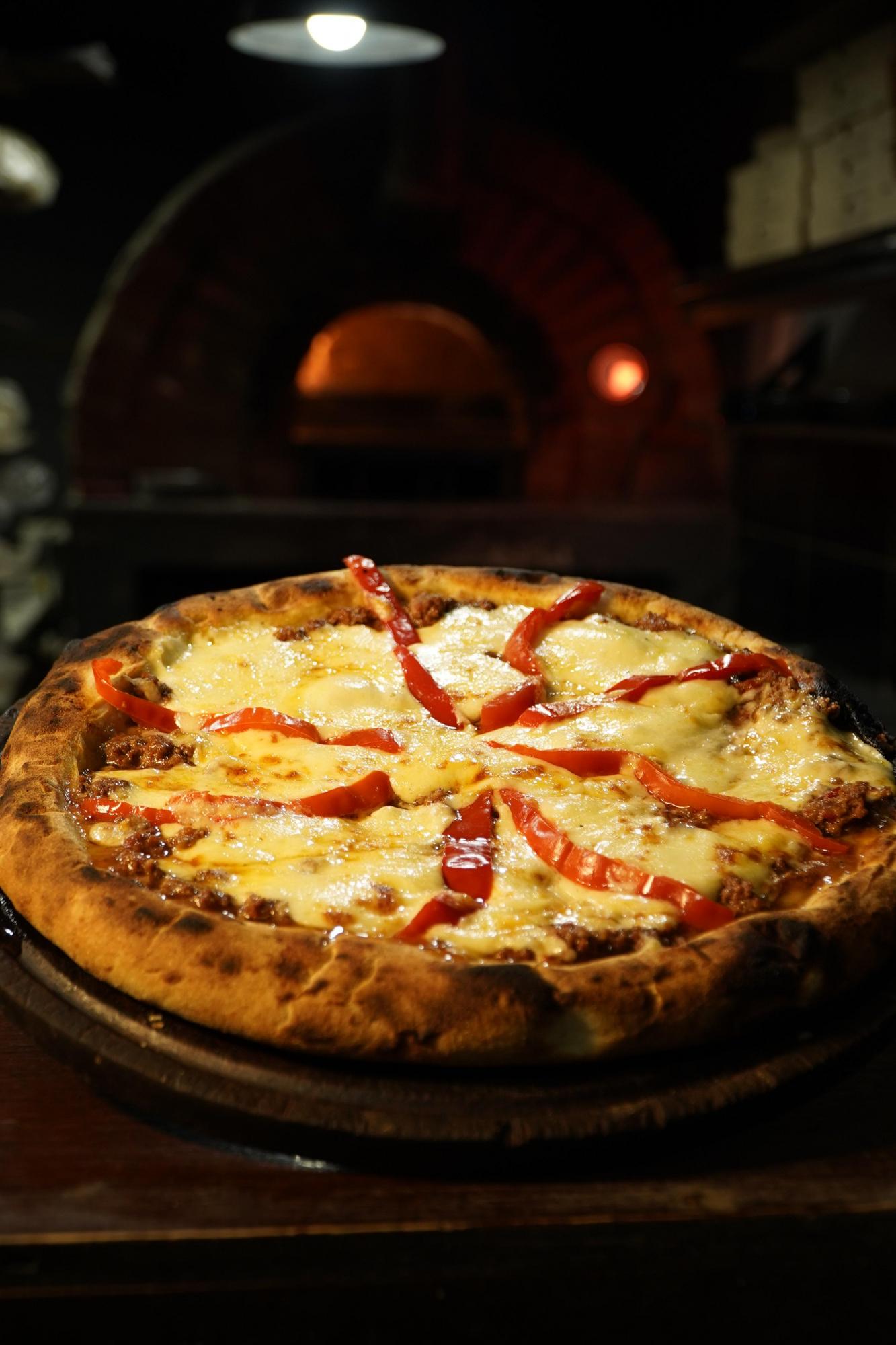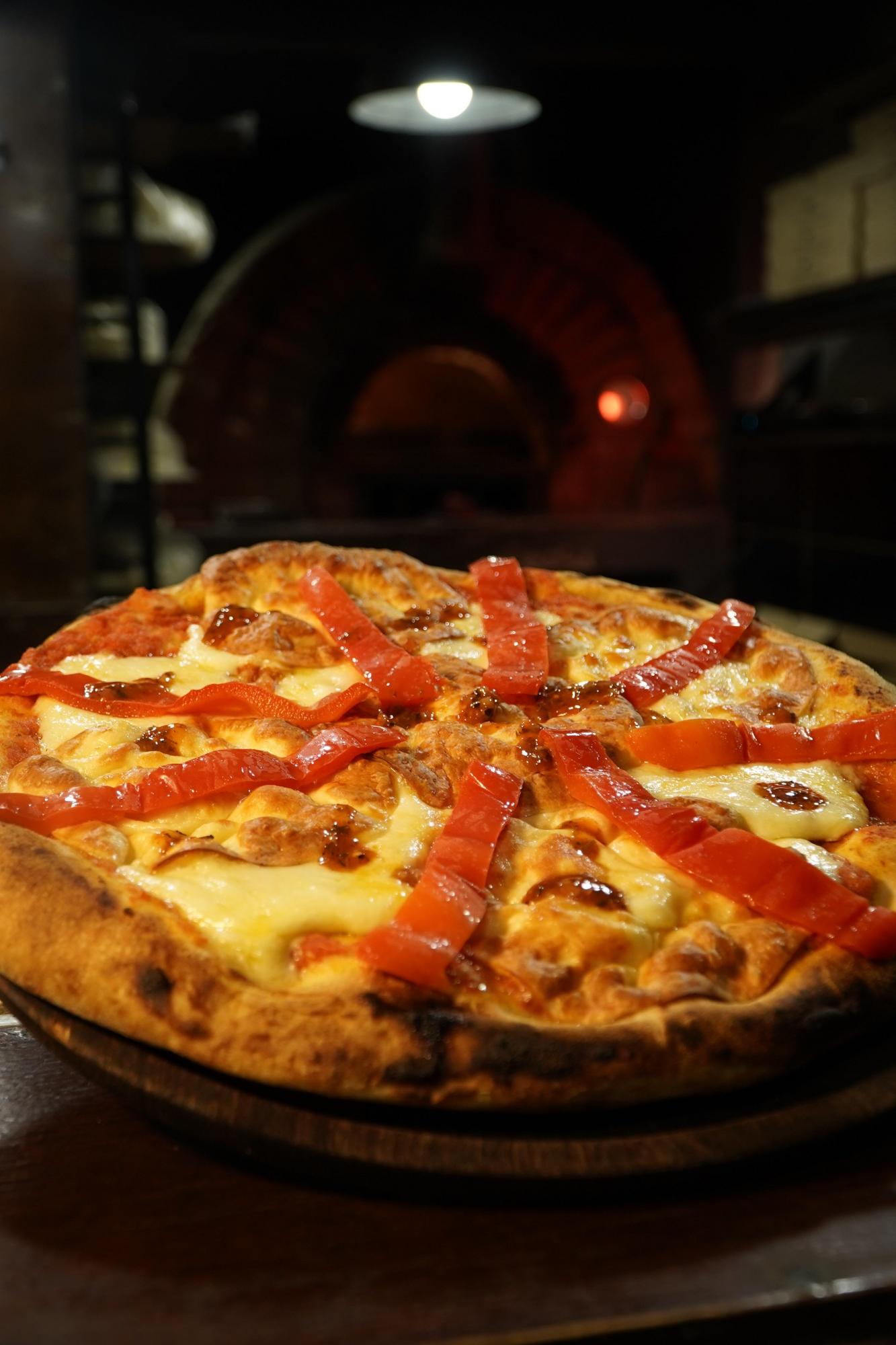 Salsa de tomate, muzzarella, panceta ahumada, morrones asados, queso parmesano y aceitunas negras.