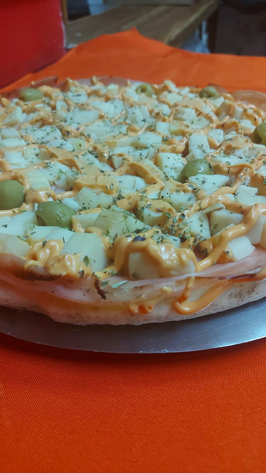 SALSA, MUZZA, TOMATE EN RODAJAS, JAMON COCIDO, CEBOLLA, HUEVO DURO, MORRON PICADO, PROVO EN DADOS, OREGANO