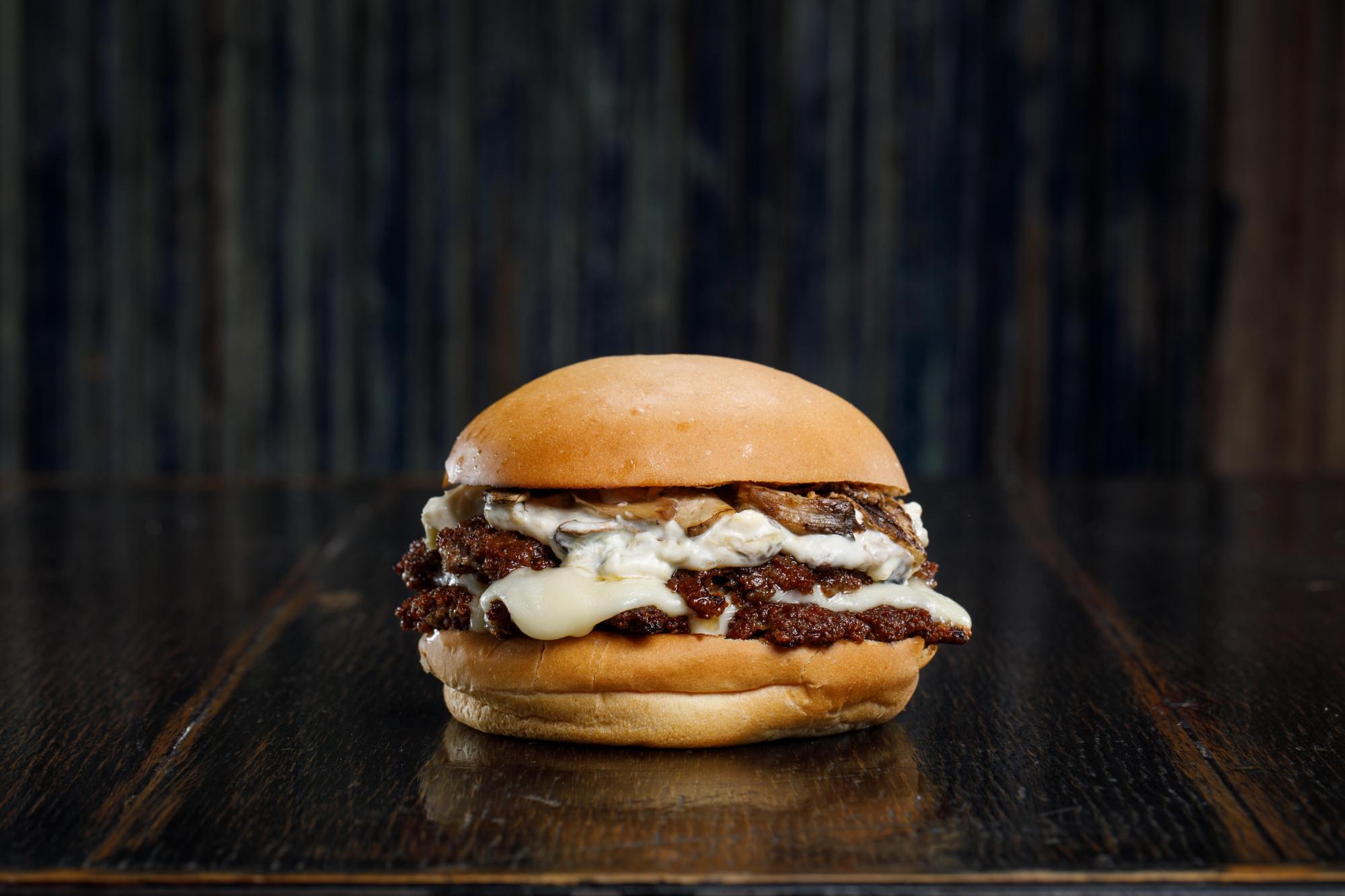 Carne de 110gr, queso dambo, queso azul, champignones y cebolla caramelizada
