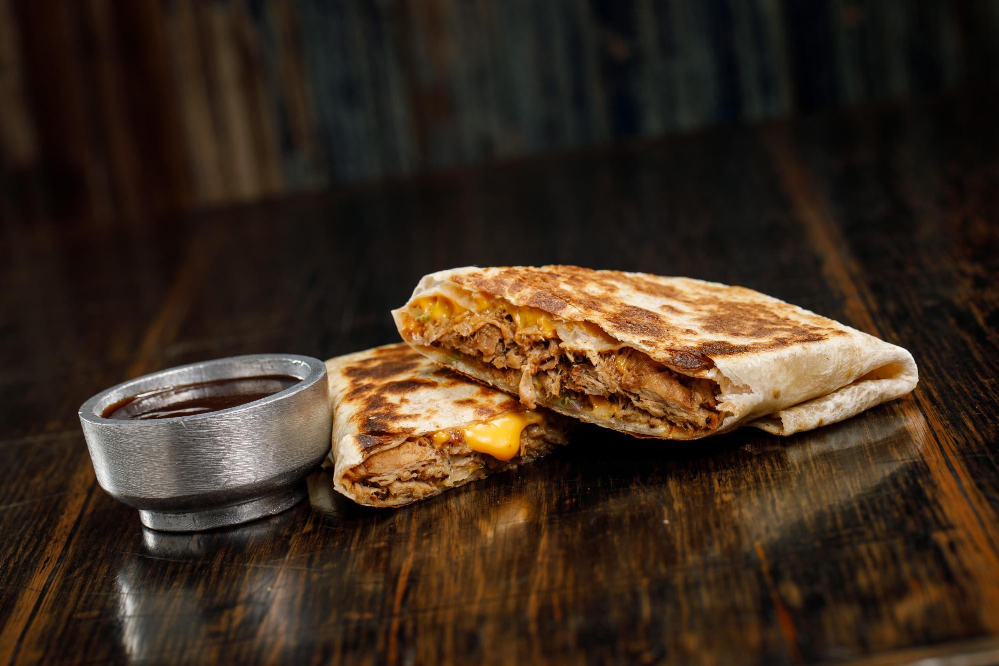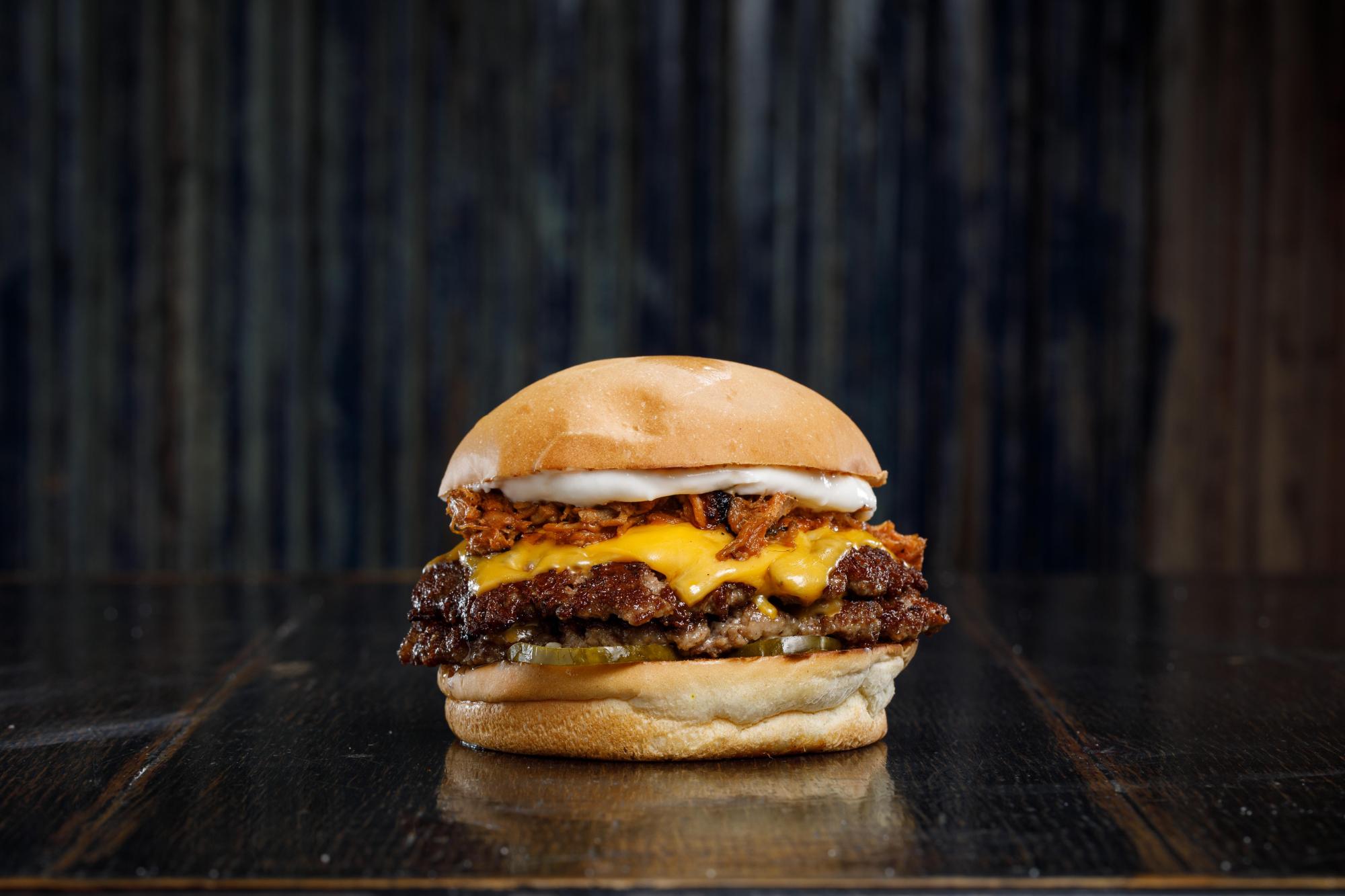 Carne de 110gr, cuadruple cheddar, pepinillos, alioli y pulled pork