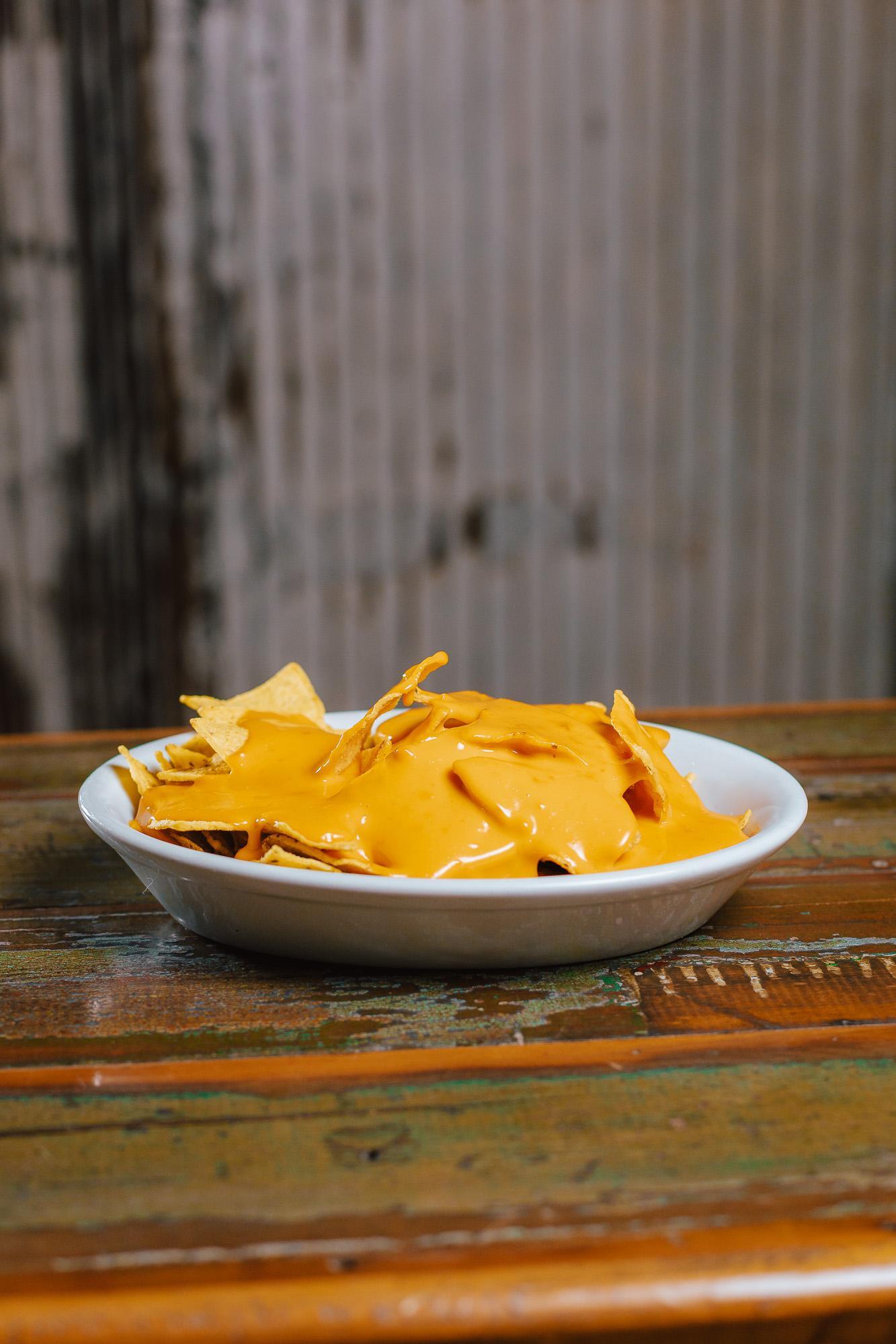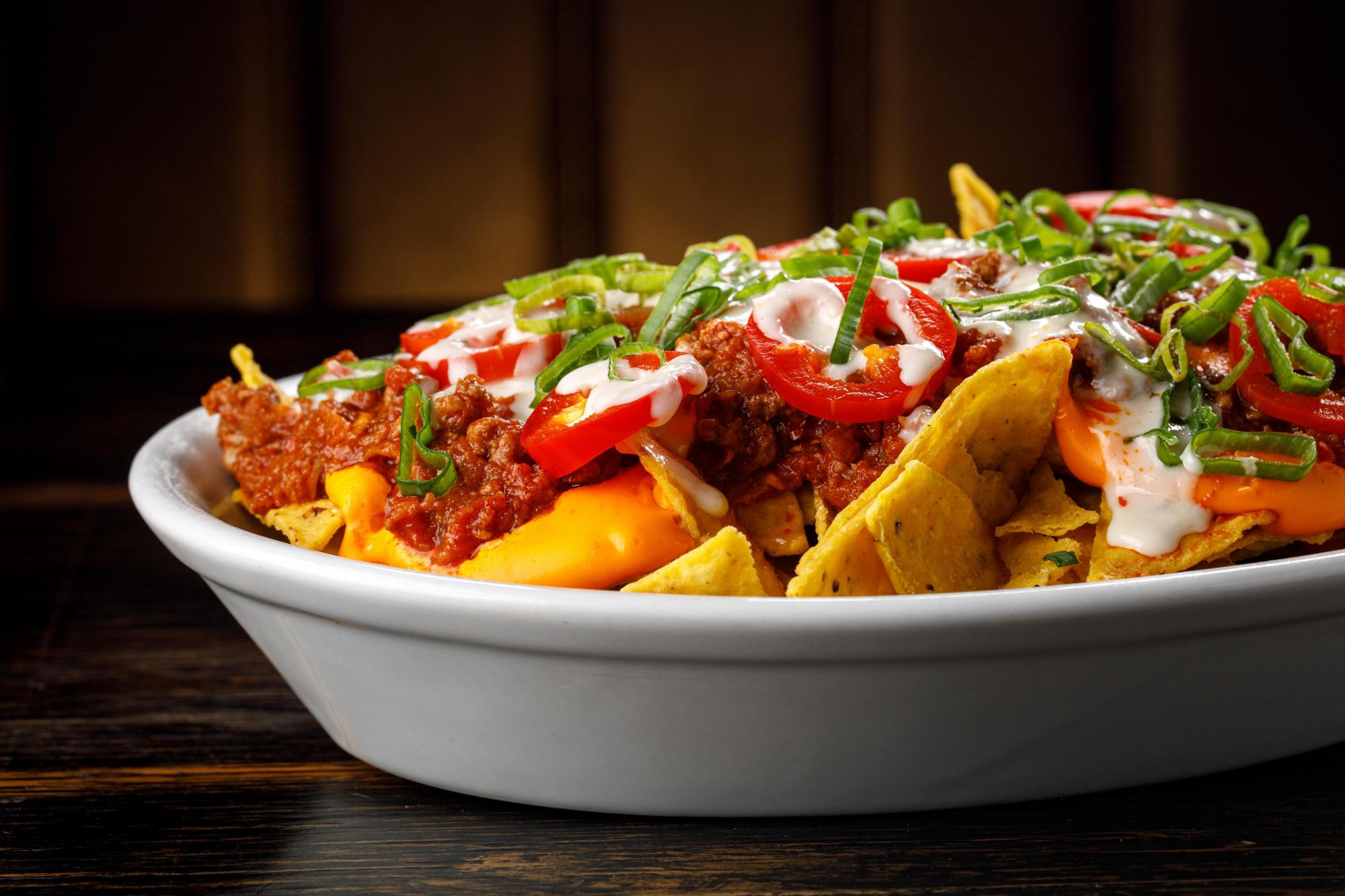 Nachos con cheddar, bolognesa, alioli, jalapeños y verdeo