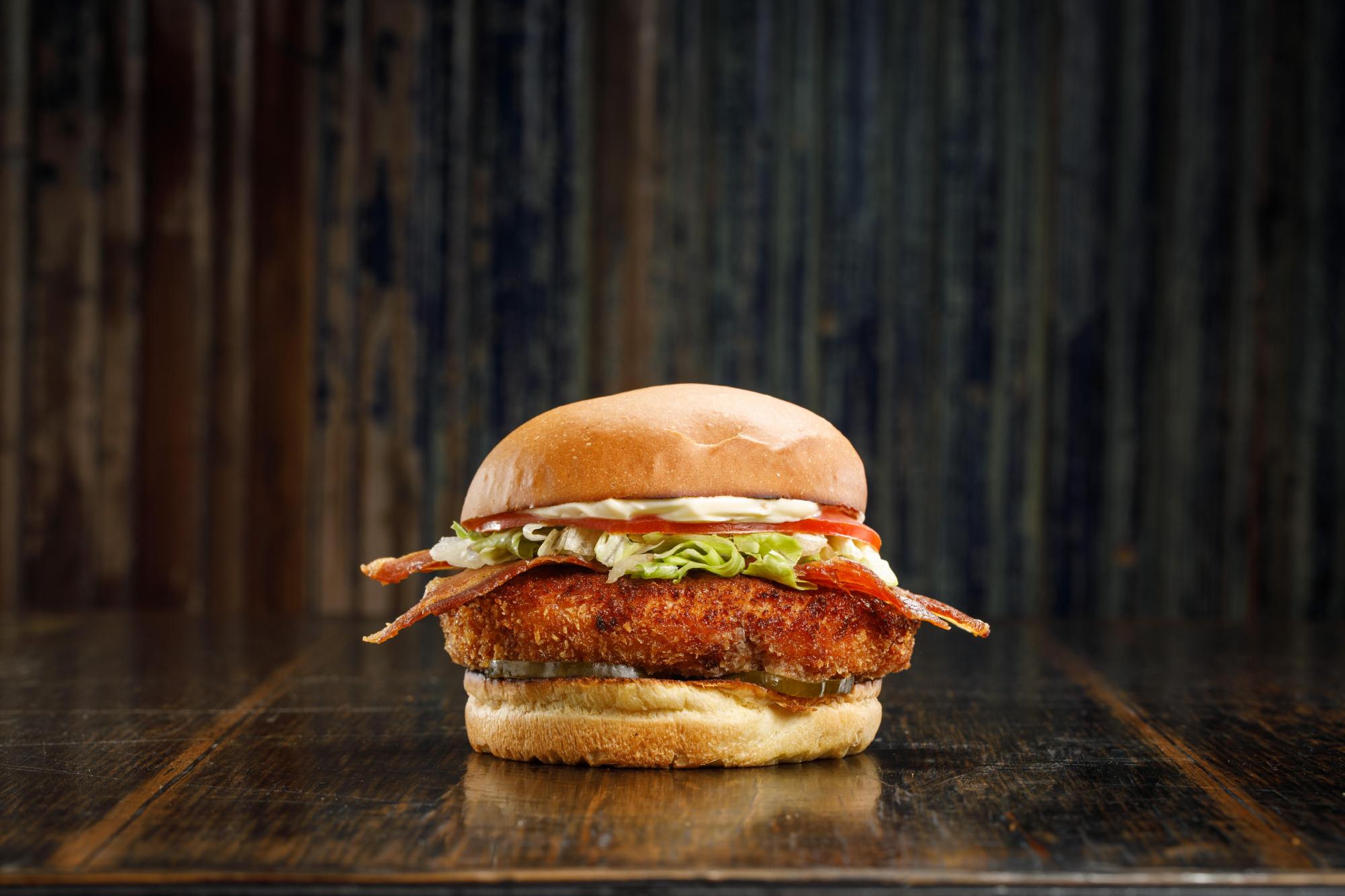 Medallón de pollo rebozado, panceta, pepinillos, lechuga, tomate y mayonesa