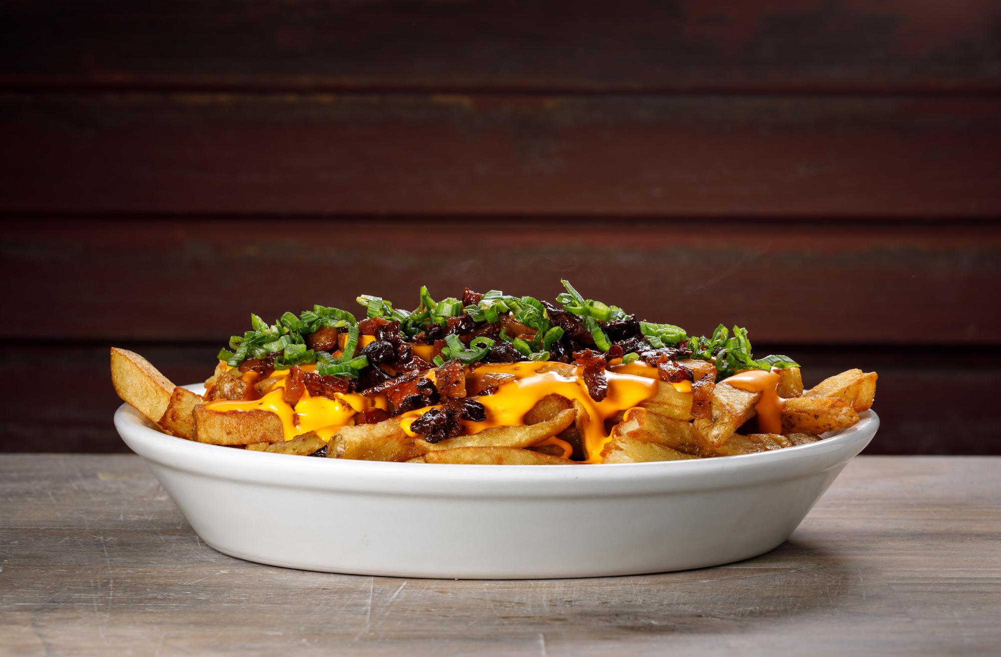 Papas con salsa de cheddar, bacon y verdeo