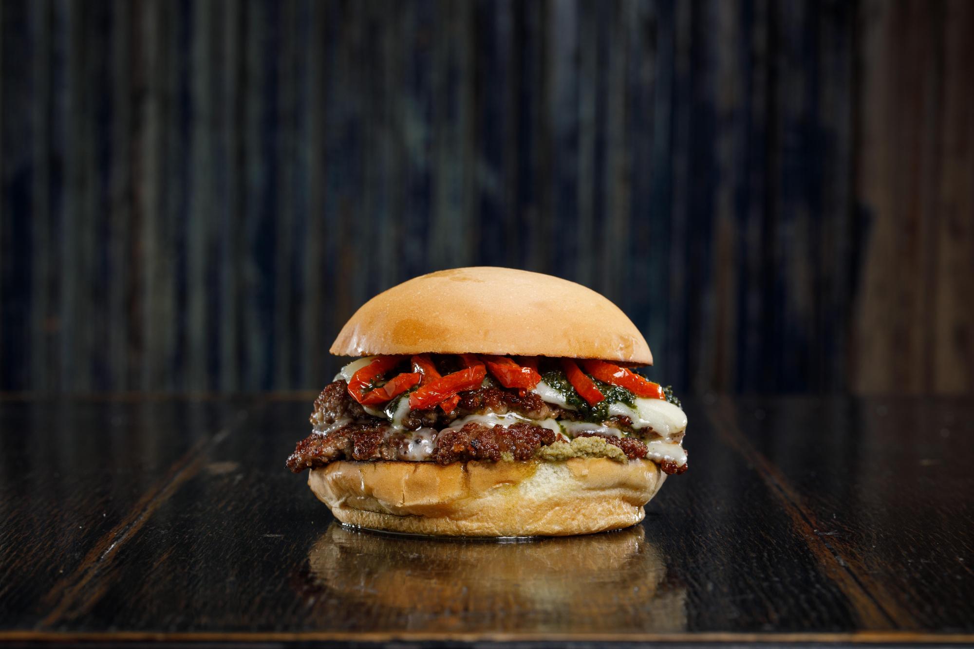 Carne de 110gr, queso dambo, tomates asados, tapenade de aceitunas y pesto