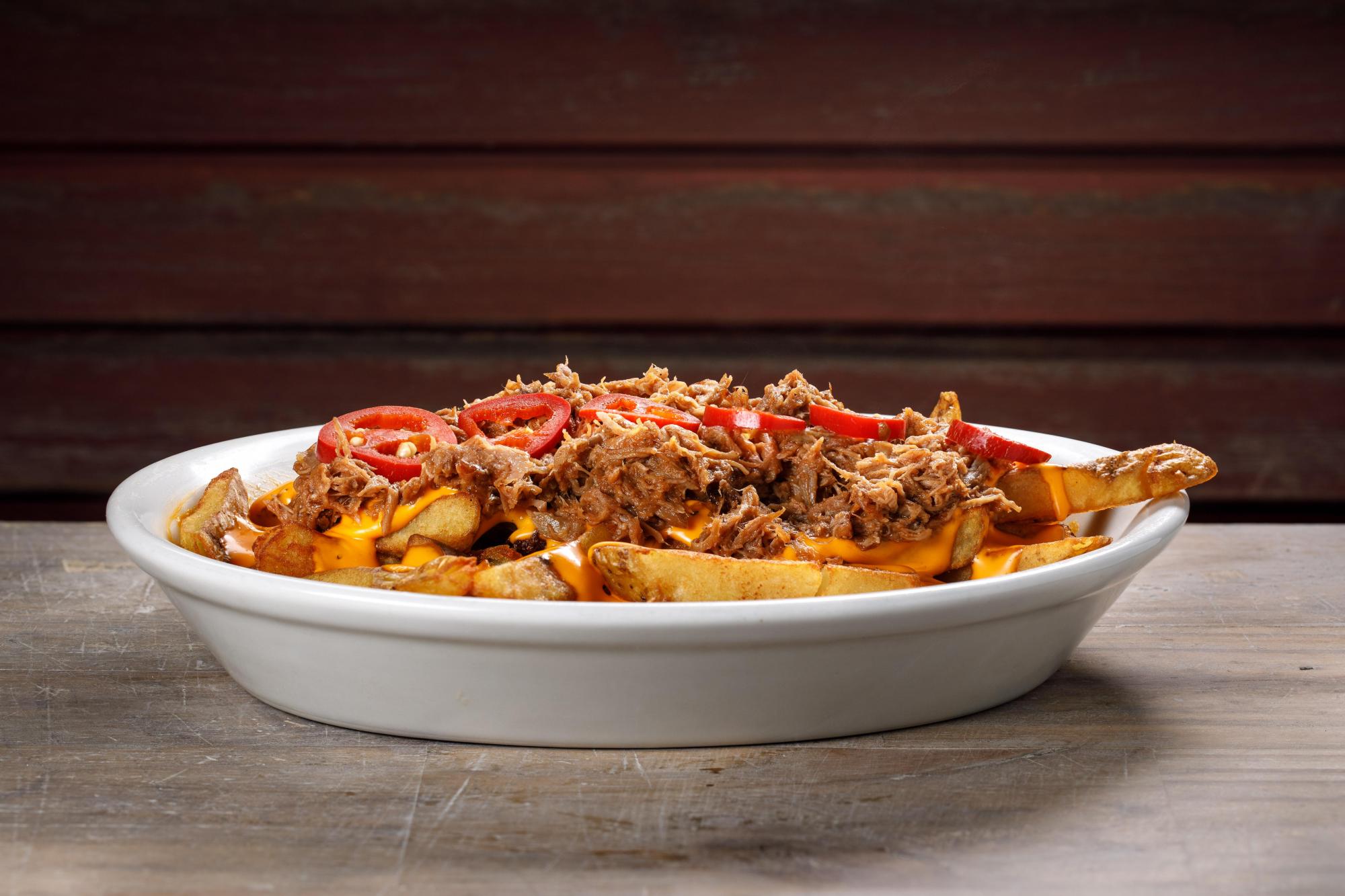 Papas con cheddar, bondiola braseada y jalapeños