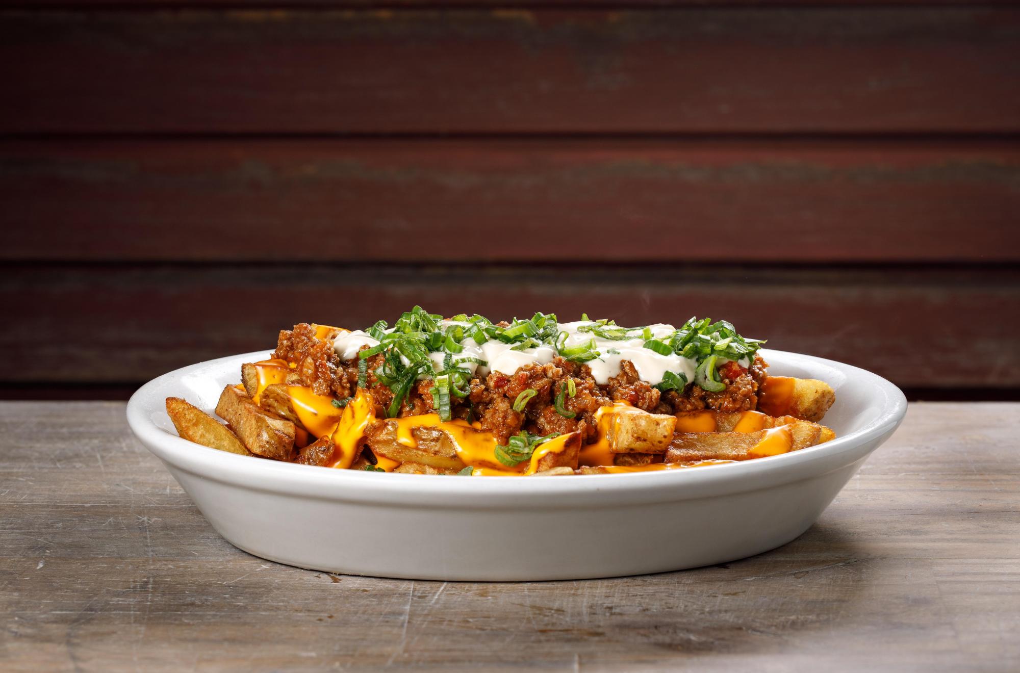 Papas con cheddar, bolognesa, alioli y verdeo