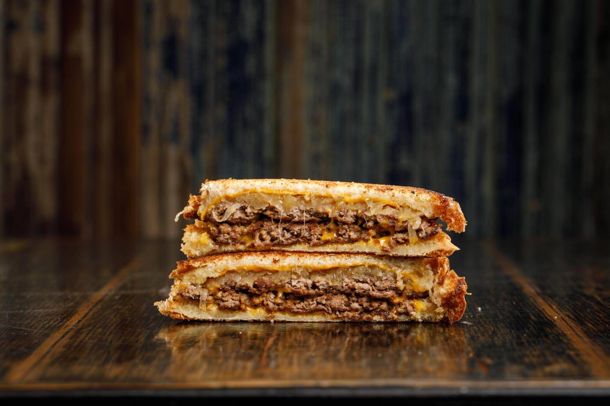 Carne de 110gr, cheddar, cebolla caramelizada y pan de molde