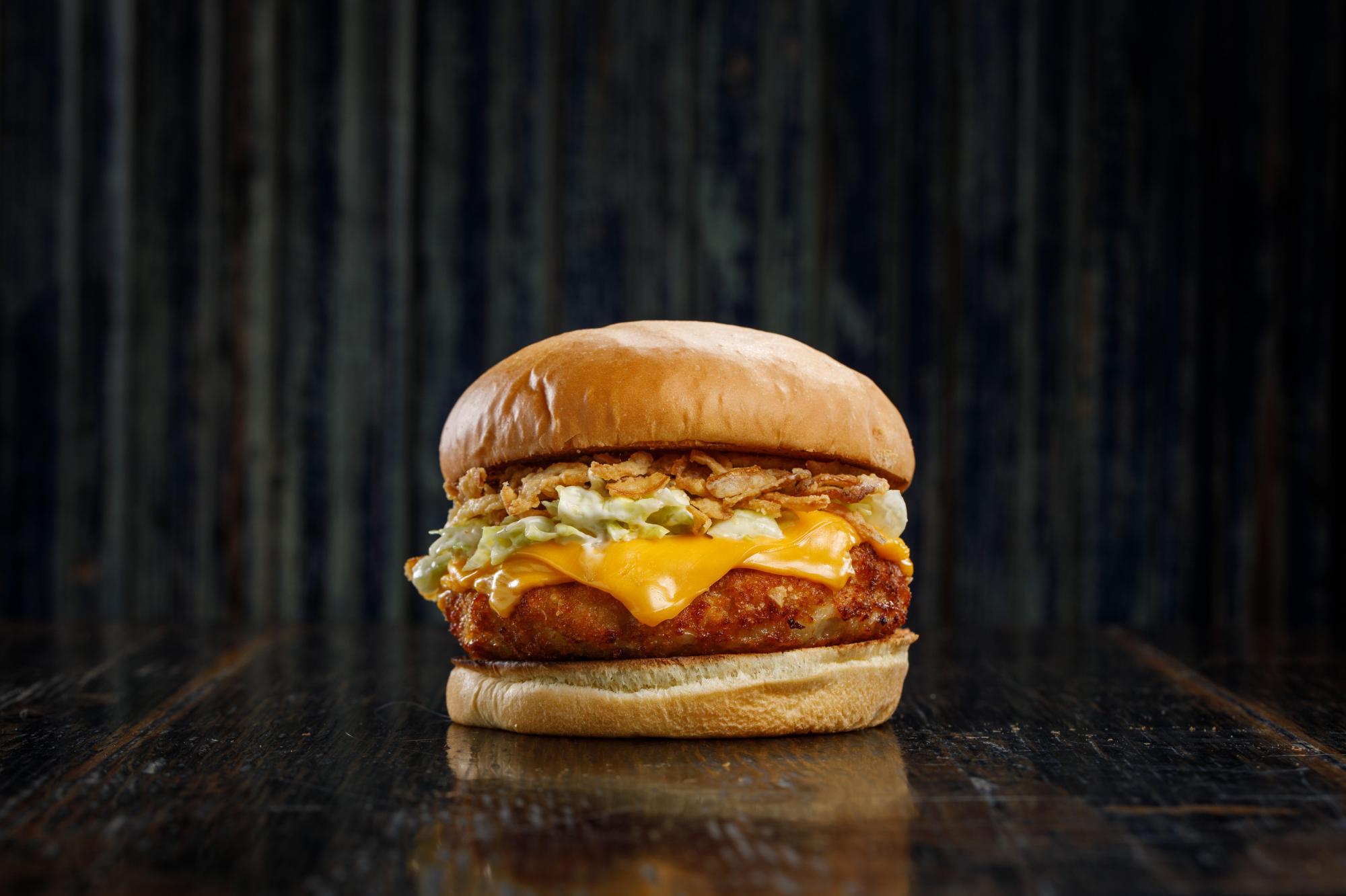 Medallon de pollo rebozado, cheddar, lechuga, aderezo caesar y cebolla crispy