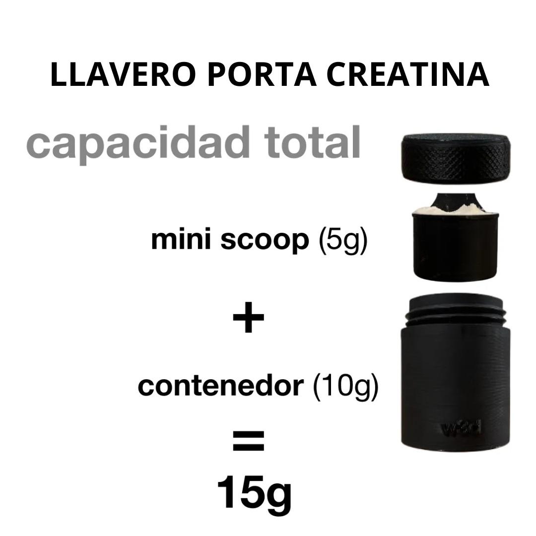 Llavero porta creatina. El contenedor de creatina tiene capacidad para guardar 3 scoop de creatina. Incluye un mini scoop para que puedas dosificar tu toma. Facil de llevar a todos lados!