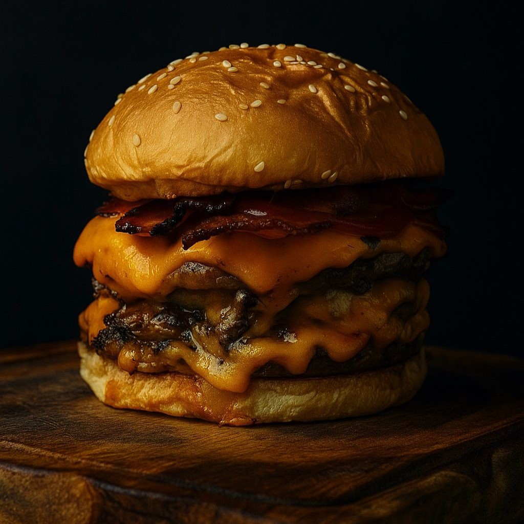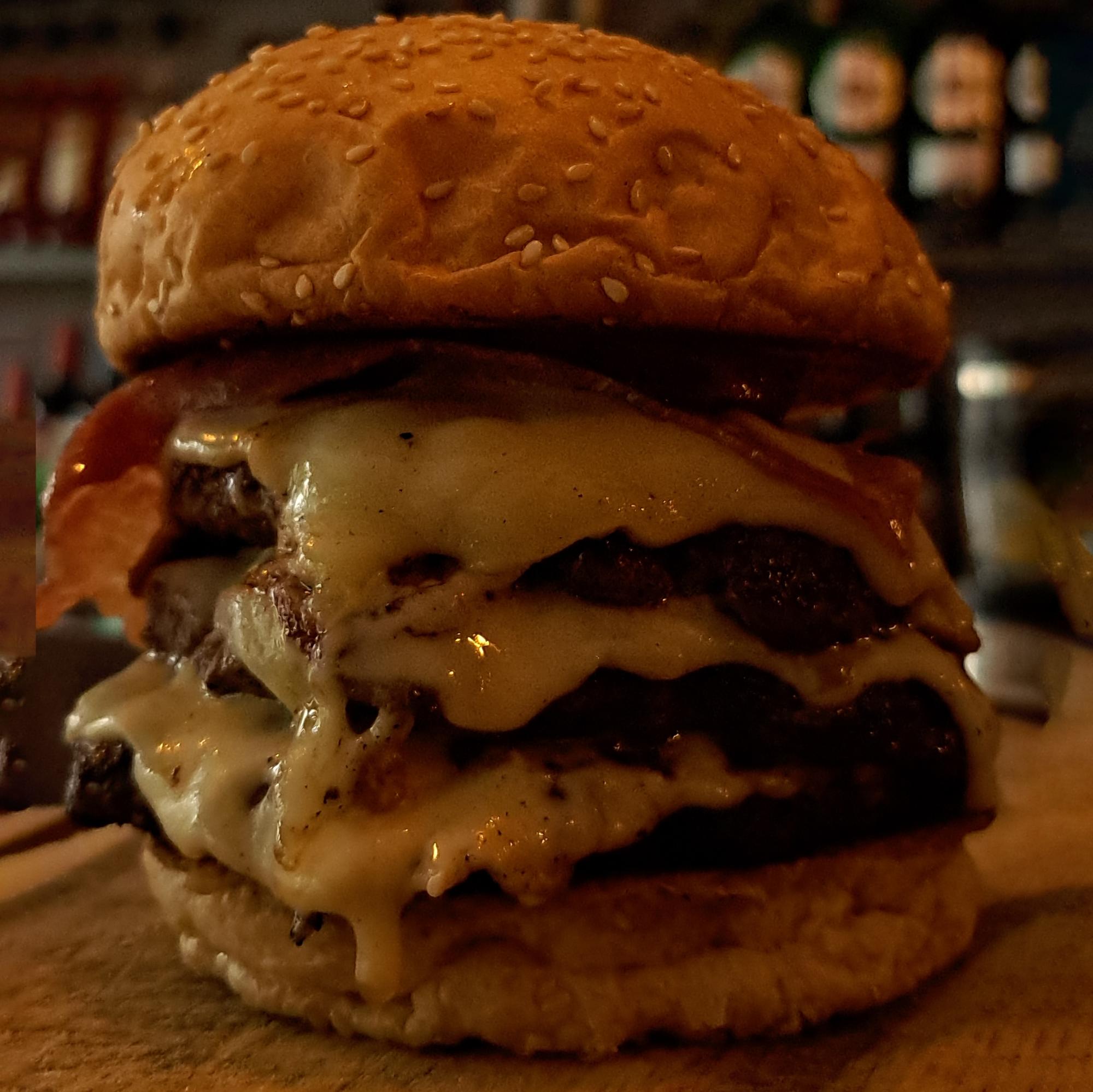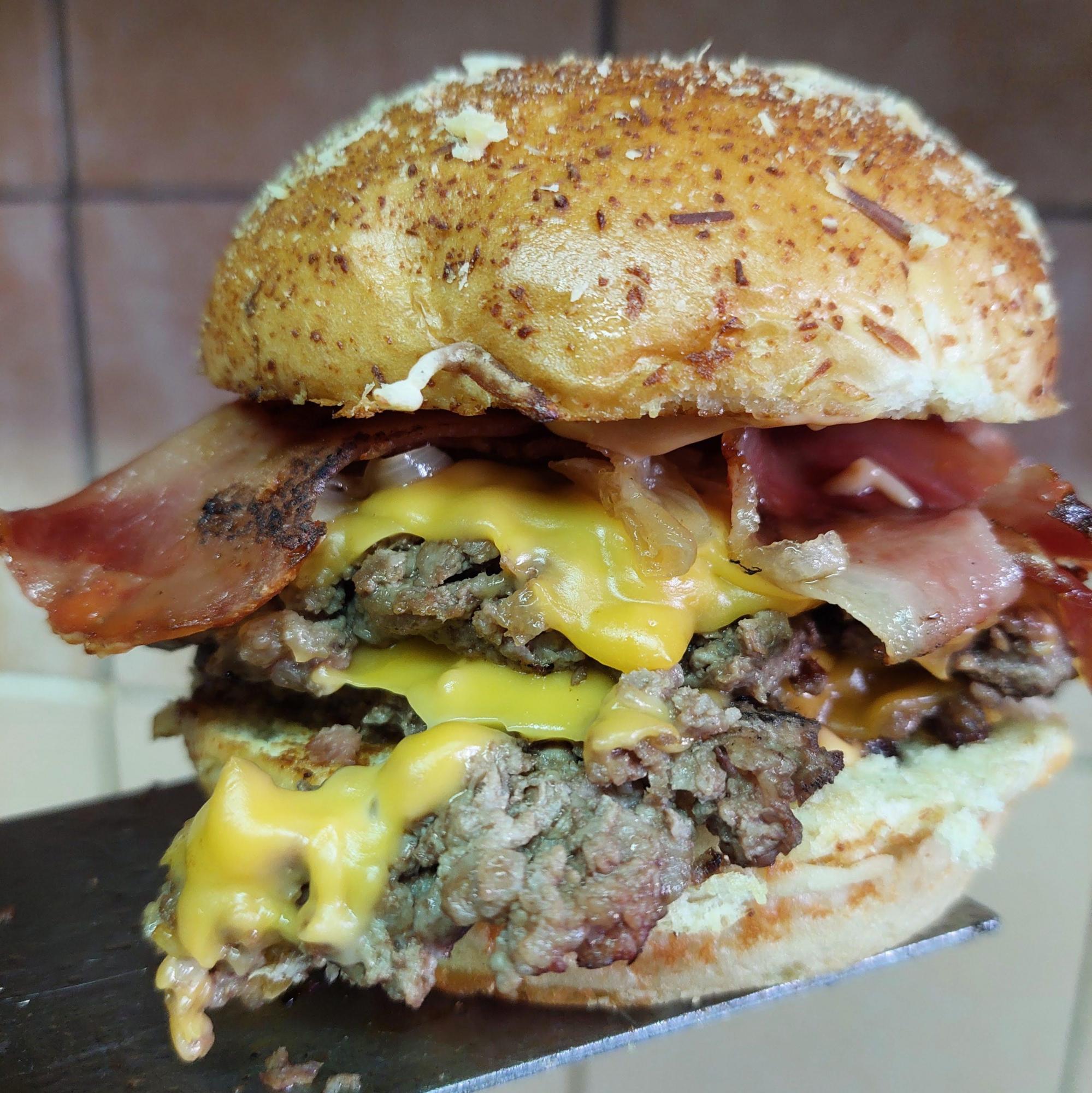 Pan artesanal, triple medallon de carne, triple queso,bacon